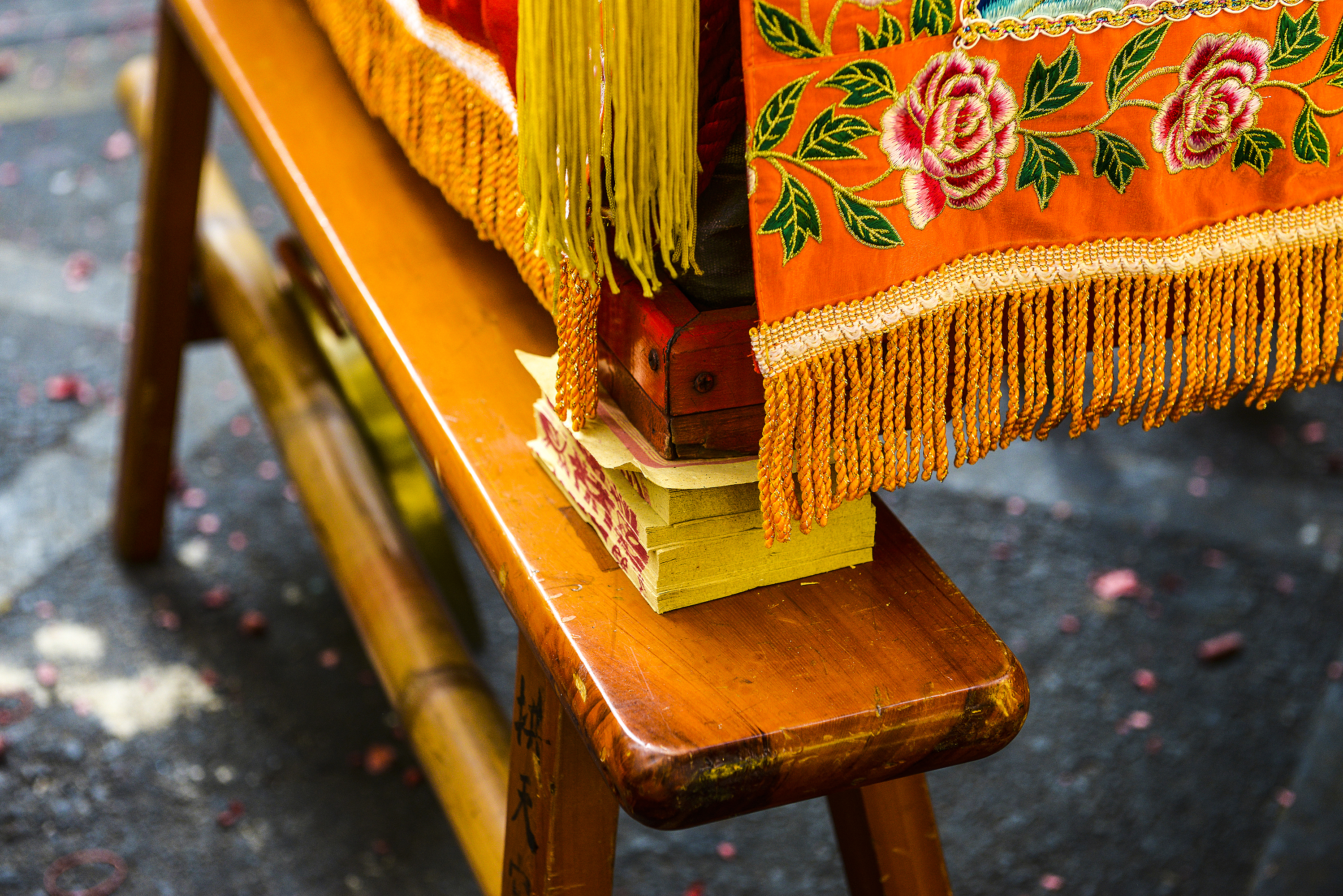 If a deity needs a break during a procession in their palanquin, joss paper will be placed between the palanquin and the benches on which it rests. This transforms an everyday setting into a sacred space. (photo by Kent Chuang)