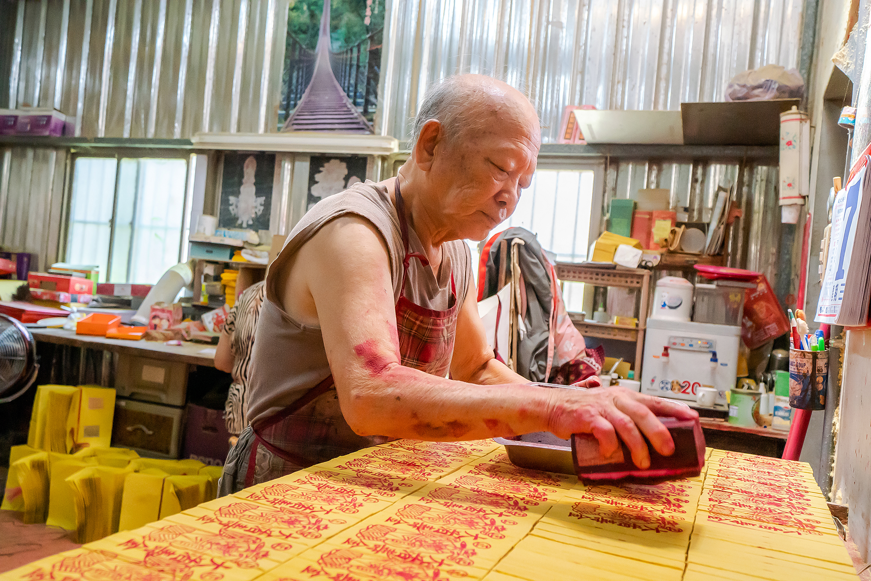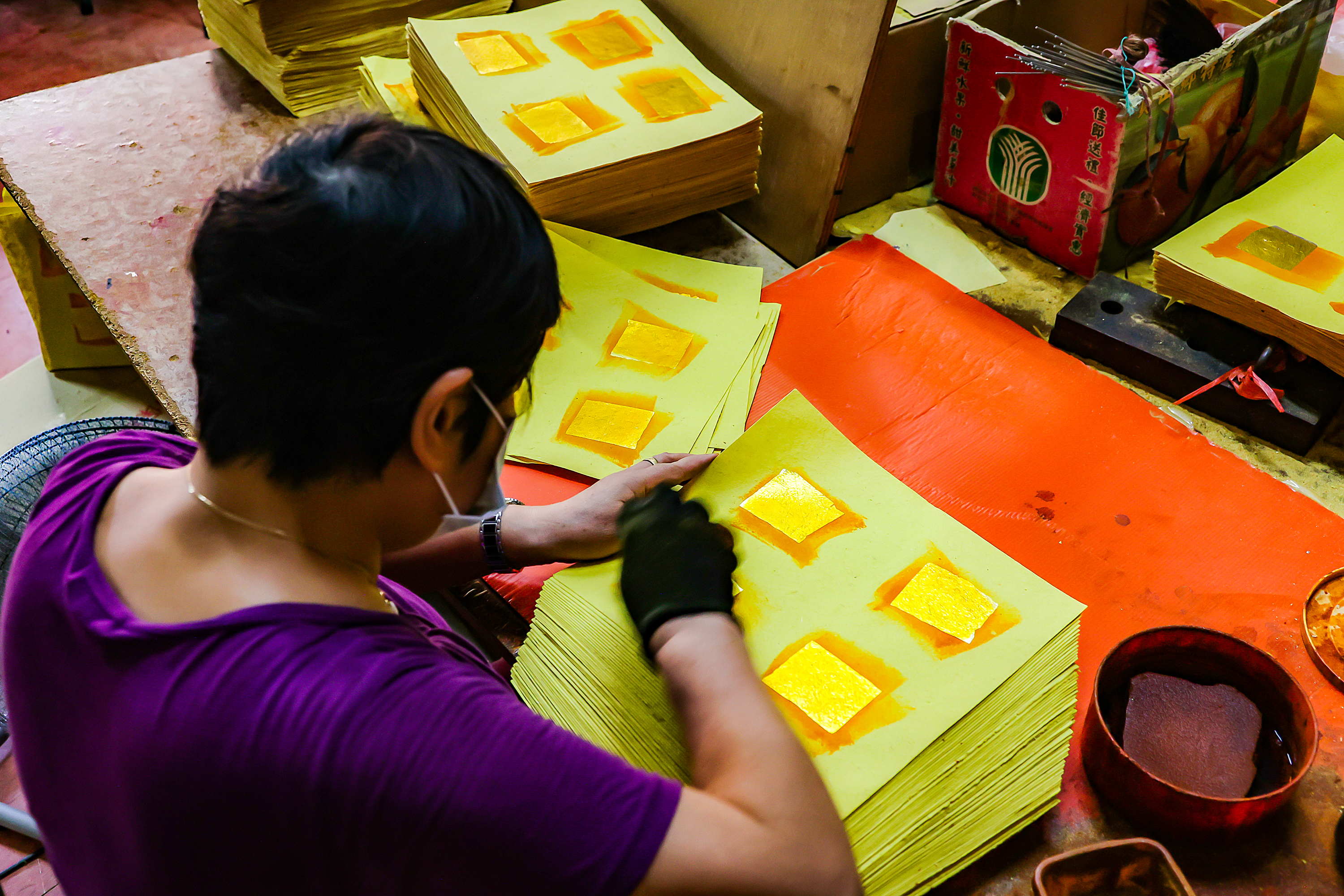 Chen Kunhui, third-generation owner of the Chen Xiehe Joss Paper Shop, continues to follow the traditional manual methods of producing joss paper.