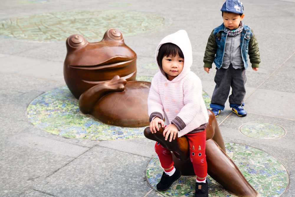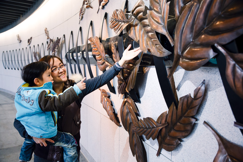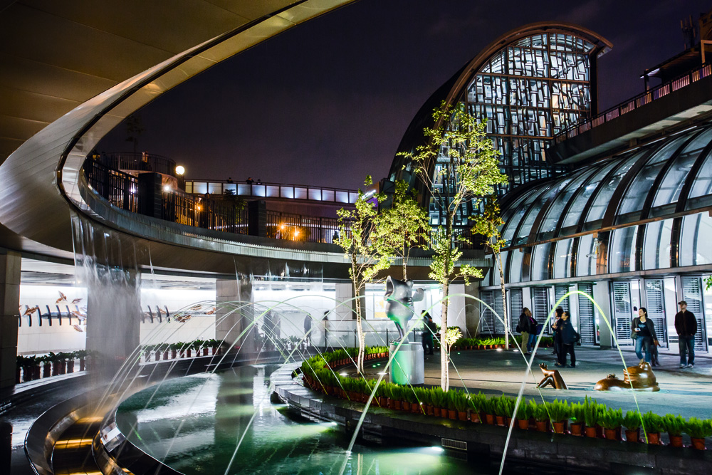 It is a weekday afternoon, and right outside we see children excitedly racing around trying to be first to climb the big brass frog lying in the garden plaza; meanwhile an elderly couple are sighing with admiration as they take in the “Autumn Leaves Traveler” installation artwork that conceptually encompasses the MRT, the people, and nature. There are also quite a few foreign tourists, pausing in their walkabouts to wait for the regularly scheduled and very lovely “fountain curtain” water show.
