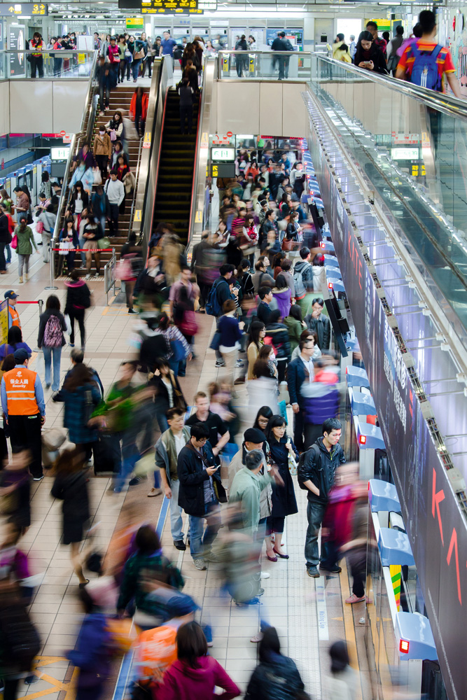 The Bannan Line, so named because it runs between Banqiao and Nangang, is the busiest line in the Taipei MRT system, and reaches sardine conditions during rush hour. The photo was taken at the Zhongxiao Fuxing Station.