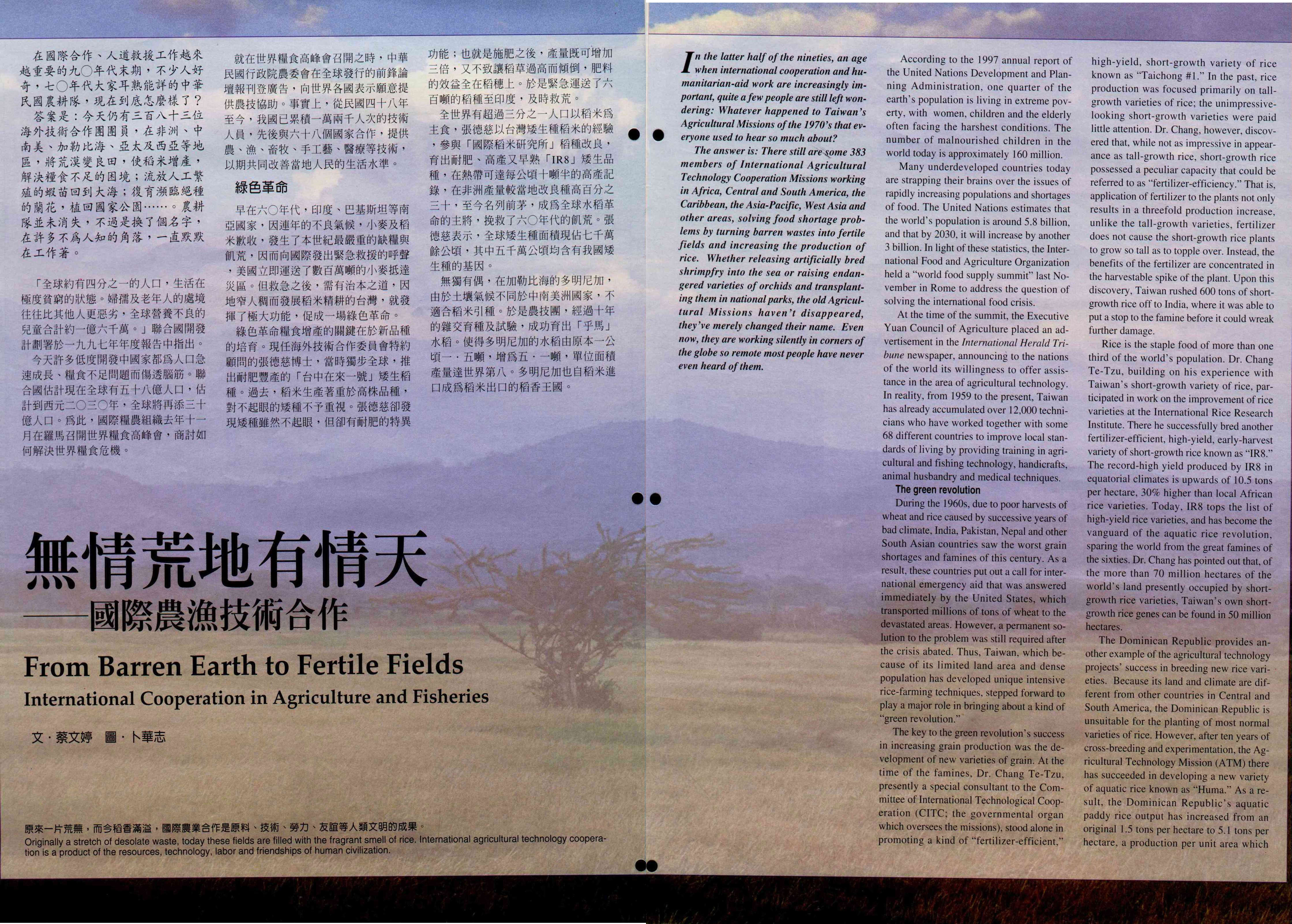 In the latter half of the nineties, an age when international cooperation and humanitarian-aid work are increasingly important, quite a few people are still left wondering: Whatever happened to Taiwan's Agricultural Missions of the 1970's that everyone used to hear so much about?
