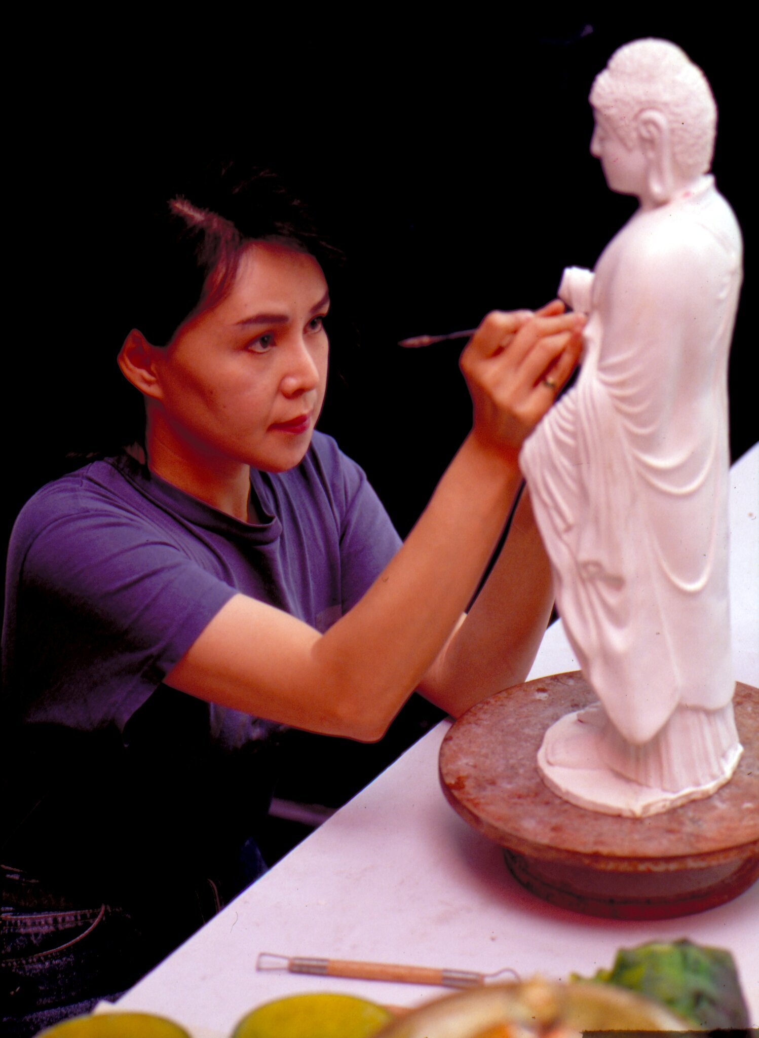 Before the recent Japanese exhibit, in order to make "Bhaisajya-guru Buddha" on time, Yang worked for a week on two hours' sleep a night. When she was making the "Fo To Buddha," because it is a large piece, it was necessary to lay it flat, and she stood in one place bent over for 40 hours. With the heat and the noise of the workshop, it is especially easy to tire, but it's common for Yang to be still at it late at night. Yang herself wonders about where this energy comes from, conjecturing that it may be from the training of once having to shoot 32 separate films in a single month.