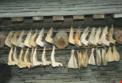 Traditionally, Bunun hunters often hung the lower jawbones of caught prey like wild boars and mountain goats over their doorways. The photo shows a stone house at the Nan-an Visitors Center.mirror.