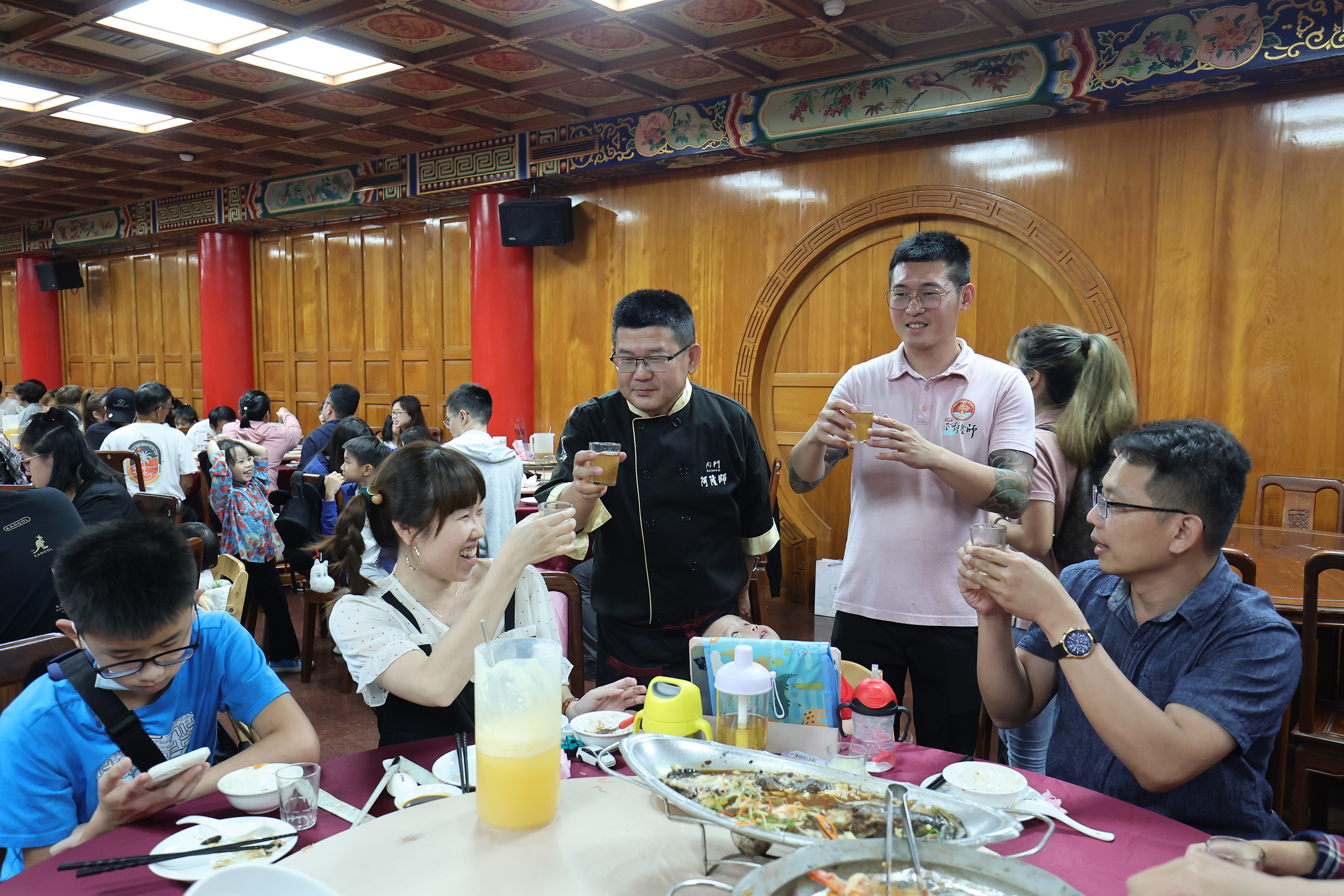 Pān-toh chef Tang Fulong (standing, left) and his son Tony (standing, right) raise a toast to their guests to thank them for attending the banquet.