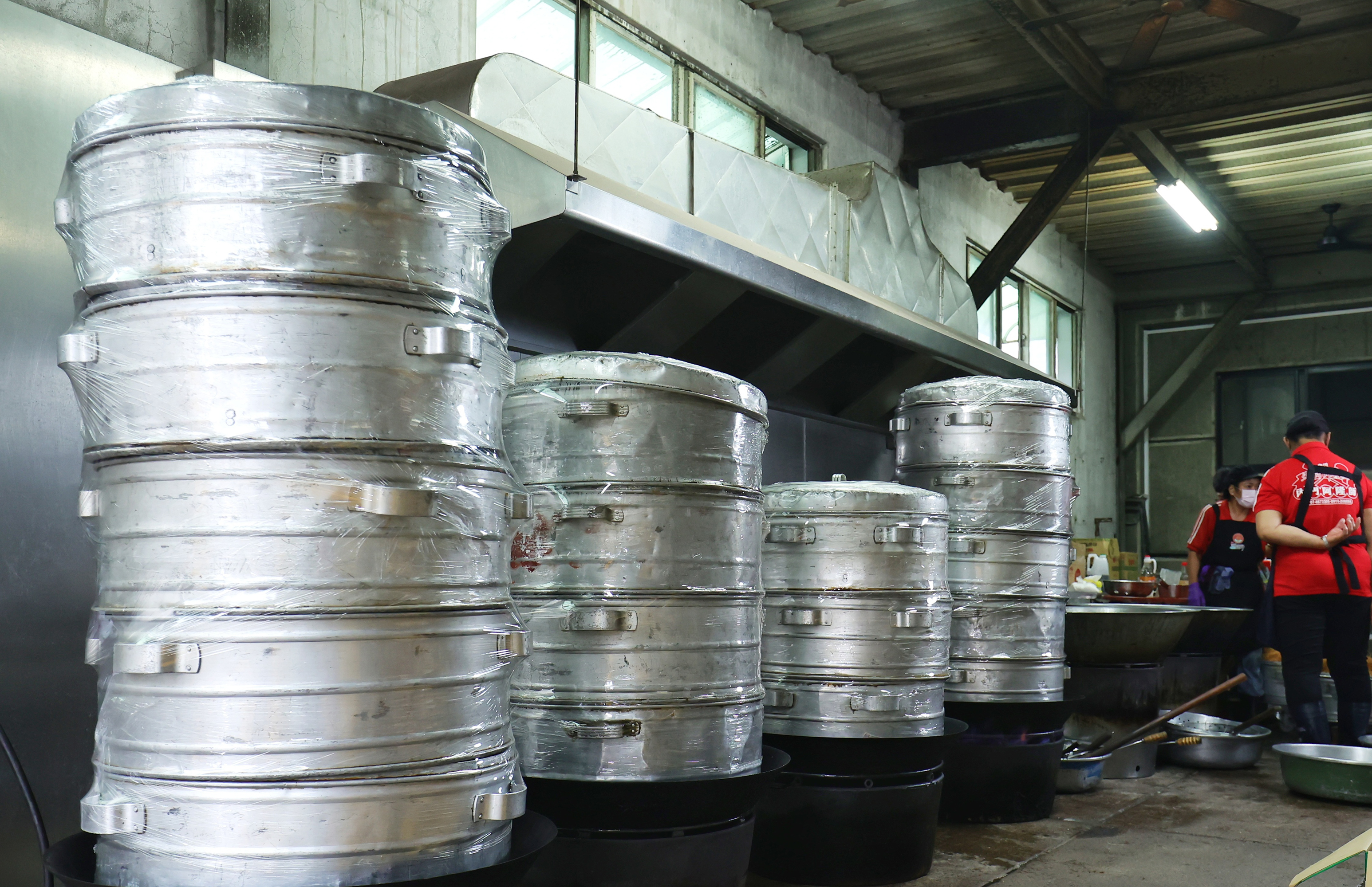 A row of steamers stacked three to five tiers high makes an impressive sight.