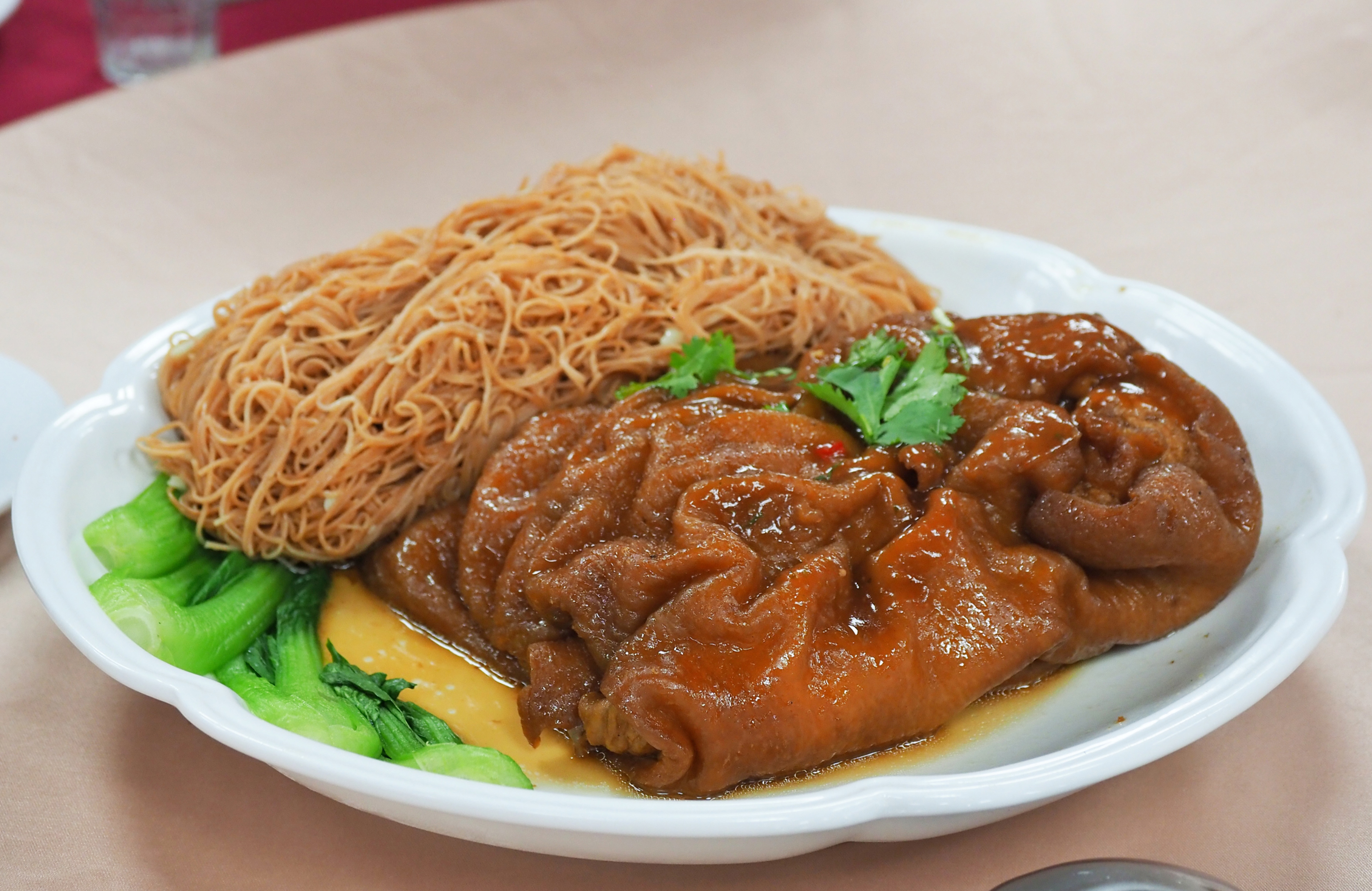 Tang Fulong says that in earlier times, pān-toh chefs would braise pork without draining the grease first. Oozing, fatty meat used to be a favorite source of dietary fat; accordingly, hong-bah braised pork was one of the most popular banquet dishes. As modern epicures have become more health-conscious, chefs have changed the way they cook this classic dish: they now deep-fry the pork first to remove the grease. The process, however, requires tremendous skill. The meat has to be crispy outside but tender inside; if not handled correctly, the texture may easily turn out like pork jerky.