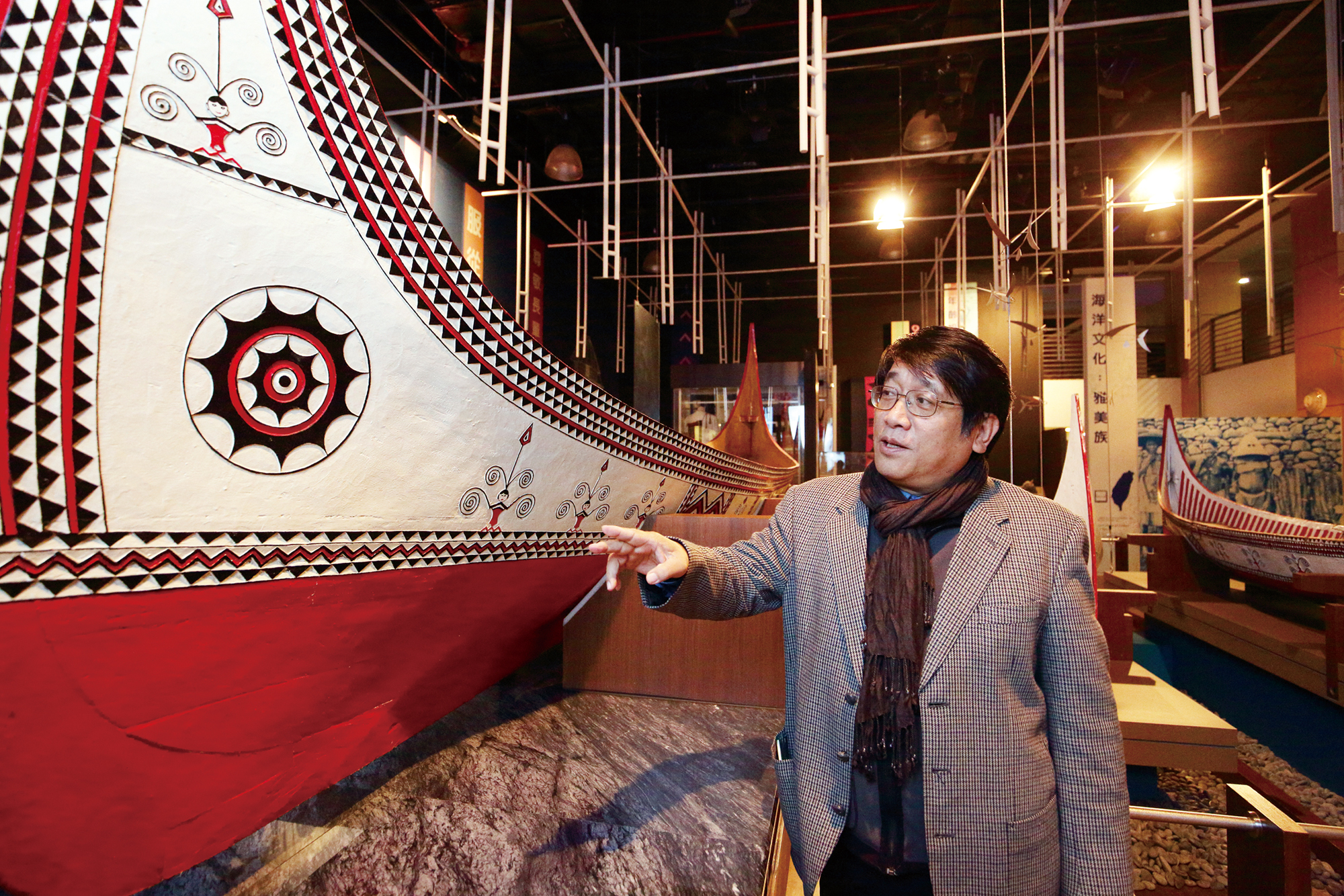 Approaching the museum, one is struck by the exterior, which resembles a huge seated Aboriginal warrior, wearing a helmet and holding a saber. In the lobby, flanking the entrance to the museum proper, are a traditional fishing boat and a carved stone panel dedicated to the ancestors, representing both the maritime and mountainous aspects of Aboriginal culture. As museum director Lin Wei-cheng explains, of Taiwan’s many Aboriginal tribes, only two—the Amis and the Tao—have traditionally made their livings off the ocean, which is why the museum made a special effort to display a traditional Tao fishing boat, ensuring the seafaring side of Aboriginal culture is represented.
