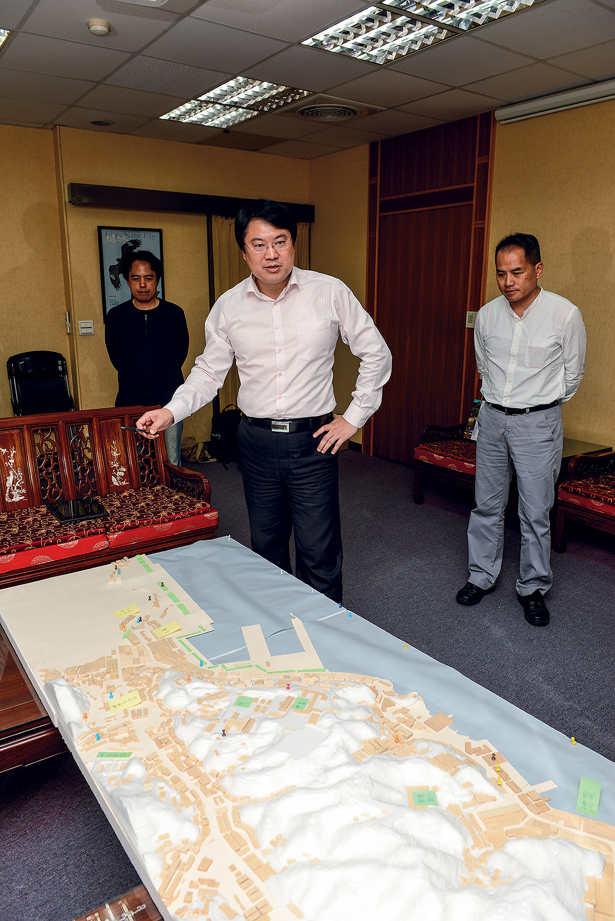 Keelung mayor Lin Yu-chang (center) stands before a relief map of the city, enthusiastically discussing the Greater Keelung Historical Scenes Restoration Project with Peng Chun-heng (right), director of the city’s Cultural Affairs Bureau. The project is intended to revive Keelung’s past glories. (photo by Chuang Kung-ju)