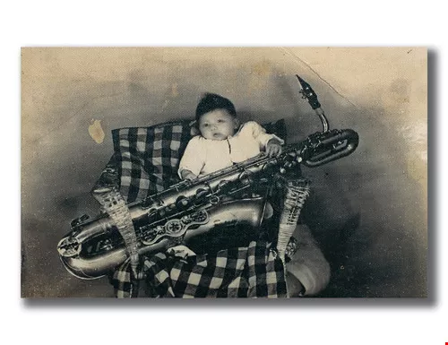 The photo shows four-month-old Chang Tsung-yao holding onto a saxophone with a carved dragon which was made by his grandfather. When Tsung-yao was still a baby, it was already preordained that he would go into the saxophone business.