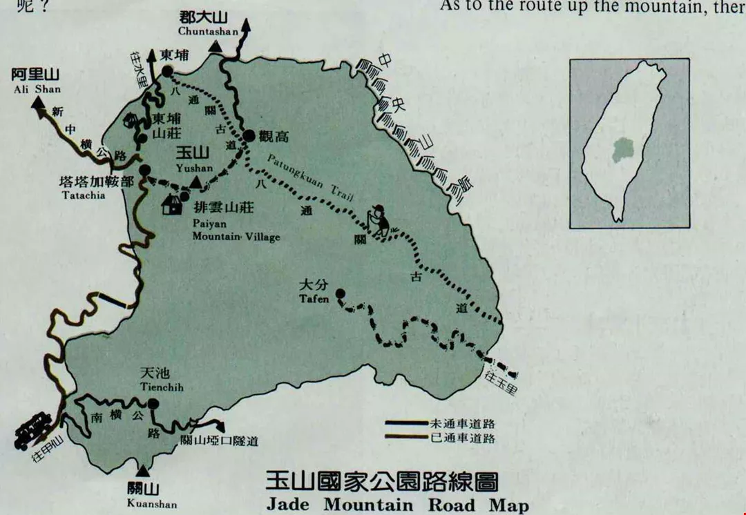 Interested in climbing up Yushan ("Jade Mountain," otherwise known as Mount Morrison) for a taste of what it's like to stand at the top of East Asia's highest mountain peak? It's not at all hard to do. The main peak of Yushan is 3952 meters high, an altitude which might tend to put some people off. However, due to the convenience of modern transport, with the new central cross-island highway going through the T'at'achia pass (elevation 2600m) at the perimeter of Yushan National Park, it's only an easy two day's saunter up to the top of the peak.