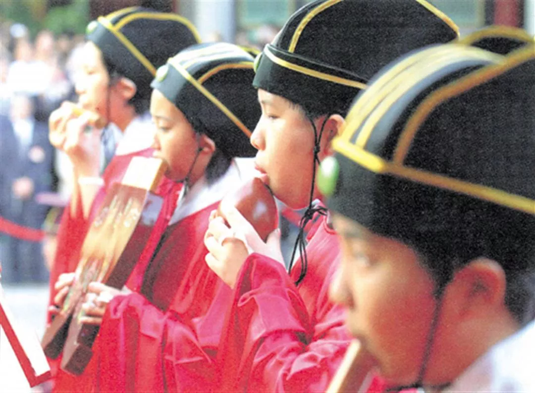 As harmonious music plays, officiators holding implements representing literary and martial arts welcome the spirit of Confucius.
