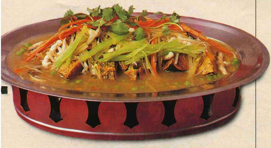 One vegetarian fish (cut into 10 pieces); a small amount each of shredded vegetarian meat, shredded ginger, shredded mushrooms, day lily, shredded bamboo shoots, and bean sprouts; one red pepper; one cup of soup stock.