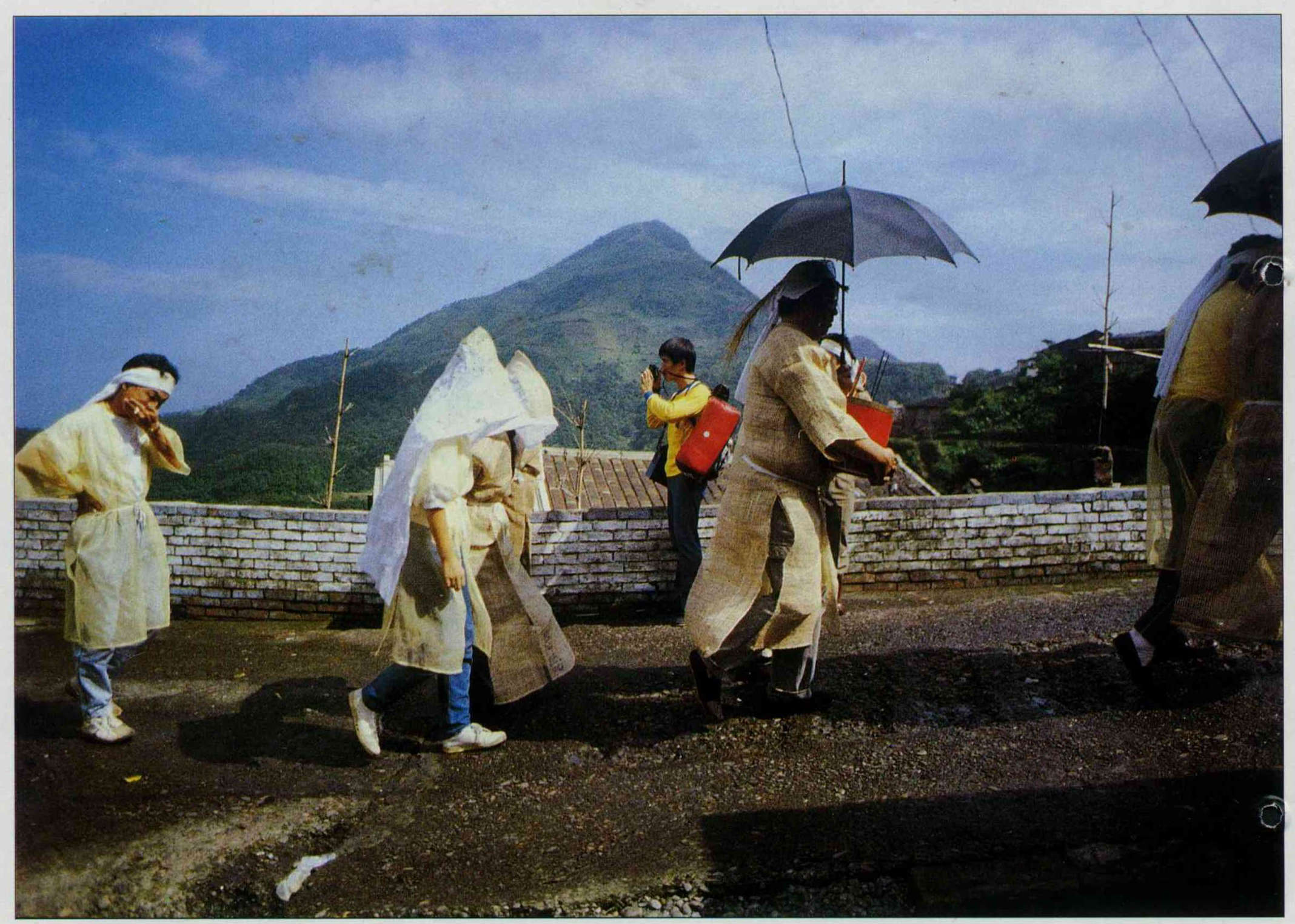 The Chinese value filial piety and insist on observing proper burial rites and sacrificing to ancestors long after their death. In Taiwanese families it is customary for male descendants to wear hempen mourning capes and carry the ancestral spirit tablet in a rice tub to bring the soul back home. (photo by Diago Chiu)