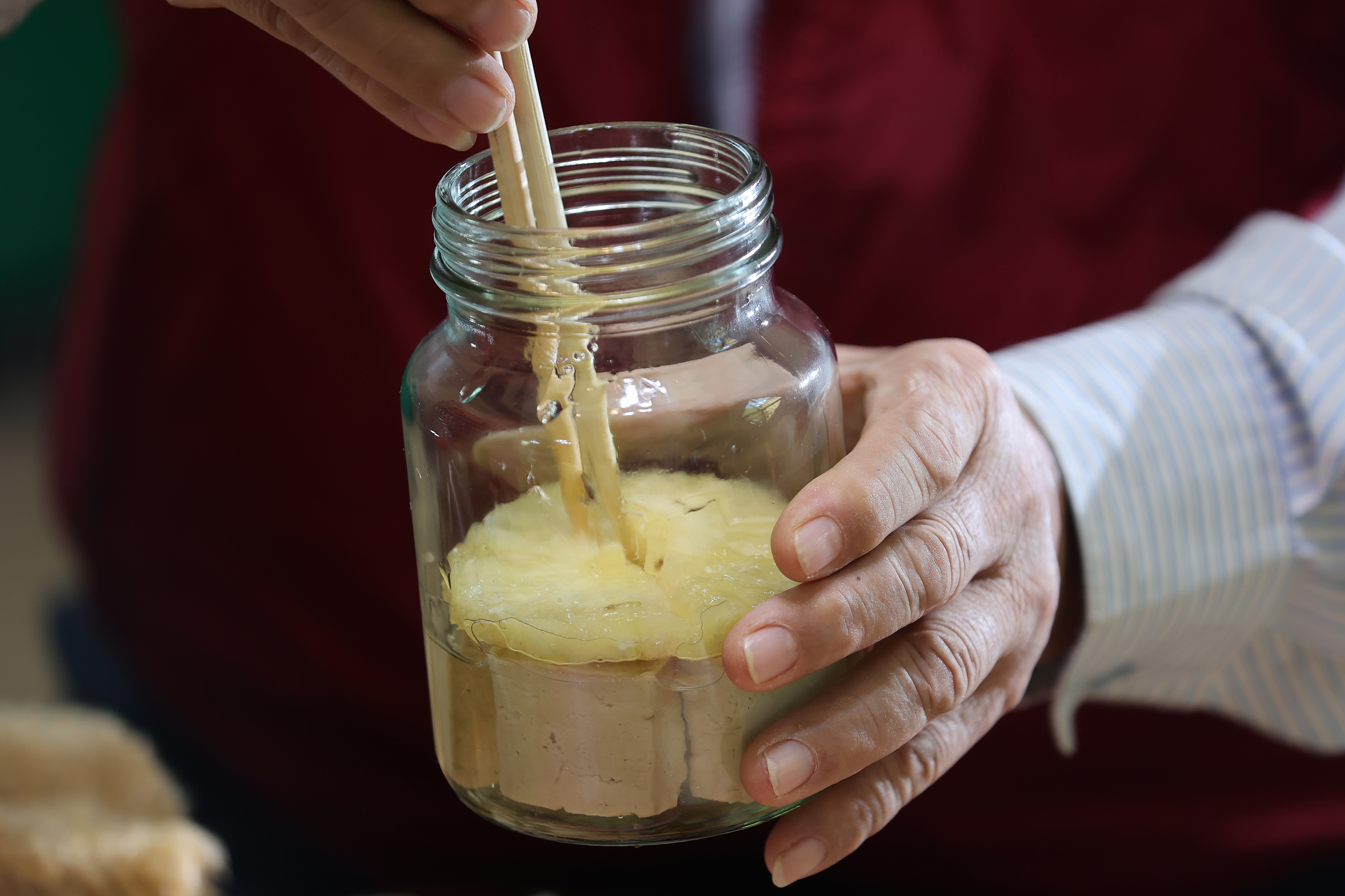 Sementara pengemasan dilakukan oleh istri Jiang di dalam ruangan, tahu kotak ditata ke dalam botol kaca, ditambahkan beberapa lembar akar manis Tiongkok (licorice Tiongkok) untuk penyedap rasa, kemudian satu sendok sari nanas, diletakan satu demi satu lapisan yang terdiri atas daging nanas dan gula pasir, diisi berulang kali hingga penuh dan terakhir sari nanas diganti dengan arak beras yang bermanfaat untuk mensterilkan, kemudian botol kaca ditutup dengan rapat.