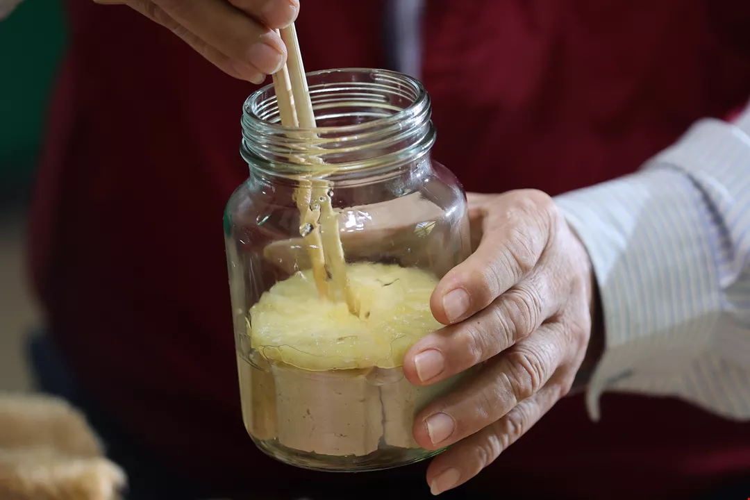 Potongan tahu, nanas, gula pasir, arak beras dimasukkan ke dalam botol secara berurutan, ditambahkan beberapa lembar akar manis Tiongkok, lalu menunggu waktu untuk proses peragian untuk menghasilkan cita rasa yang lezat.
