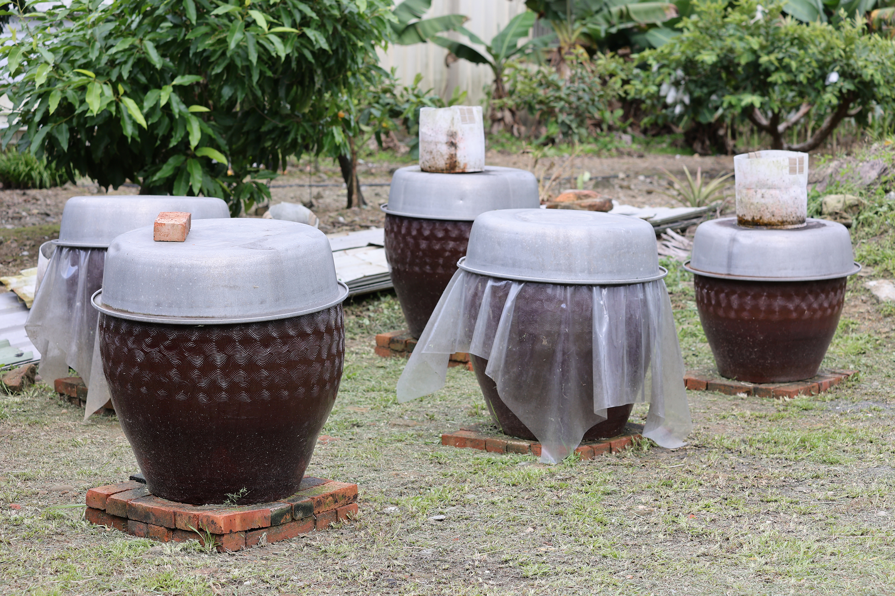 Di atas lahan rumput yang lapang ada 8 tong besar yang berisikan kecap dan miso tengah berfermentasi, sesekali terdengar bunyi lantunan erhu dari rumah.