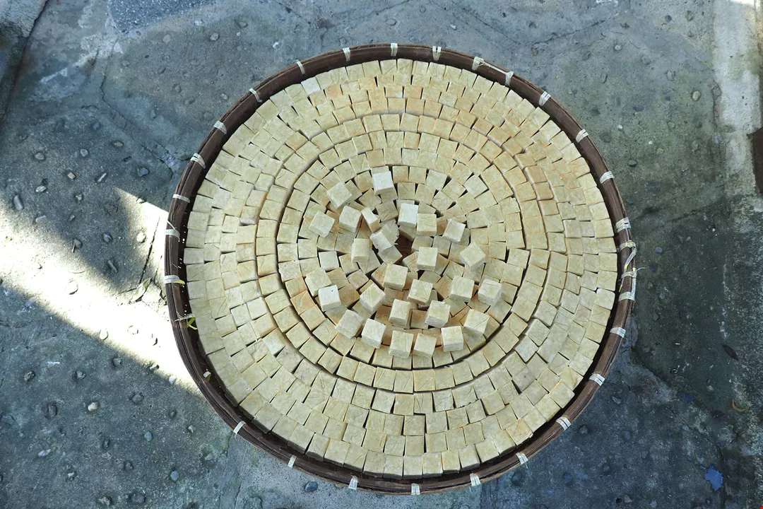 Potongan tahu dikeringkan dengan bermandikan sinar matahari, setelah kering akan dibuat menjadi tahu fermentasi.
