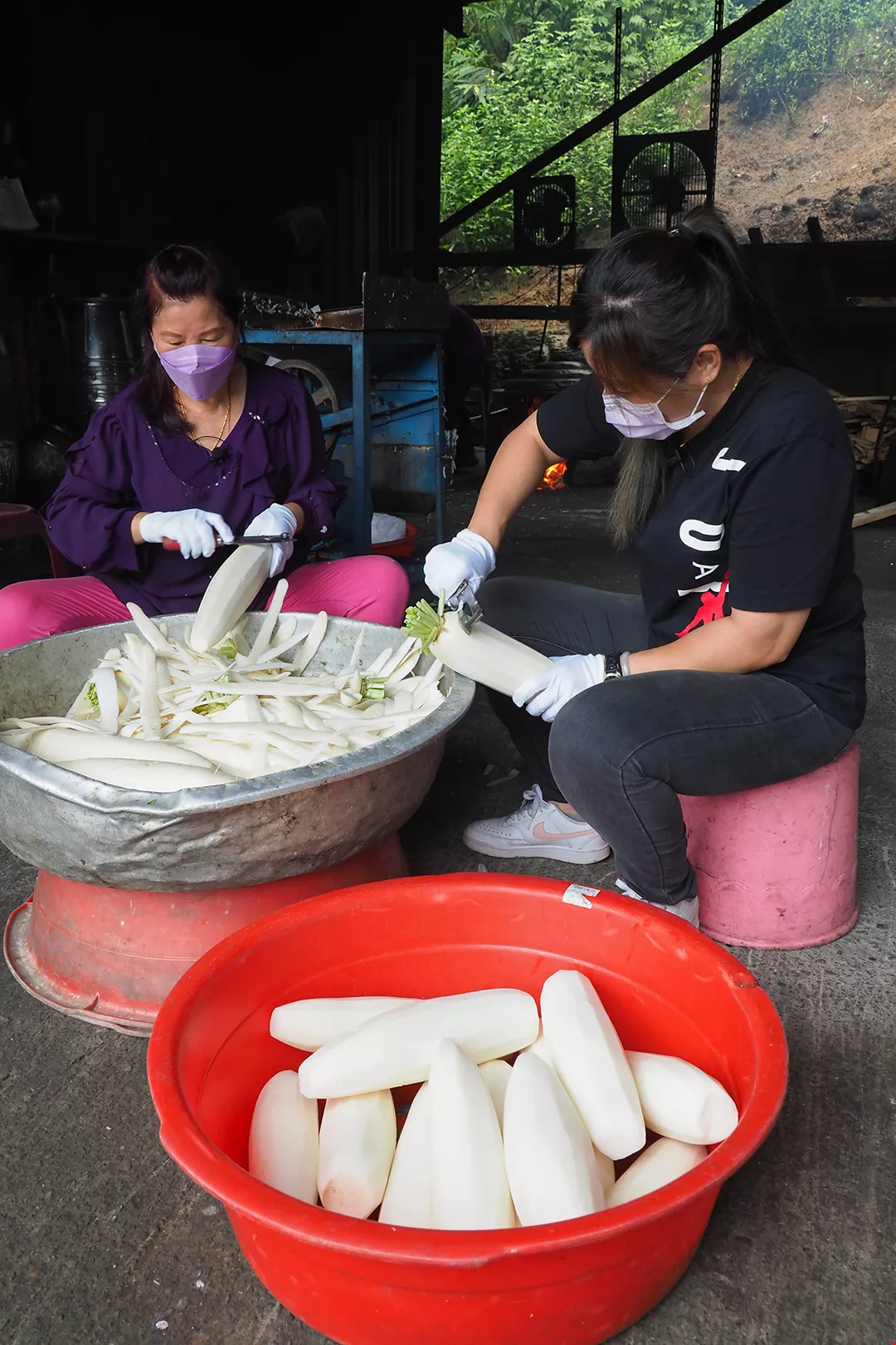 Masih ada lagi yang menjaga rasa asli kue lobak tradisional, yaitu seorang ibu Hakka yang tinggal di Emei, Hsinchu bernama Zeng Zhao-hua. Dari sebuah rumah kecil di pegunungan, tercium aroma arang dari kayu bakar, itulah rumah Zeng Zhao-hua dan suaminya yang bernama Zhuang Huan-zhang. Di hadapan mata terdapat sepuluh tungku besar menyala dengan suara kayu terbakar yang khas, semua digunakan untuk mengukus “choi-thau-pan” (kue lobak dalam bahasa Hakka), yang akan dijual oleh keluarga Zhuang ke pasar keesokan harinya.