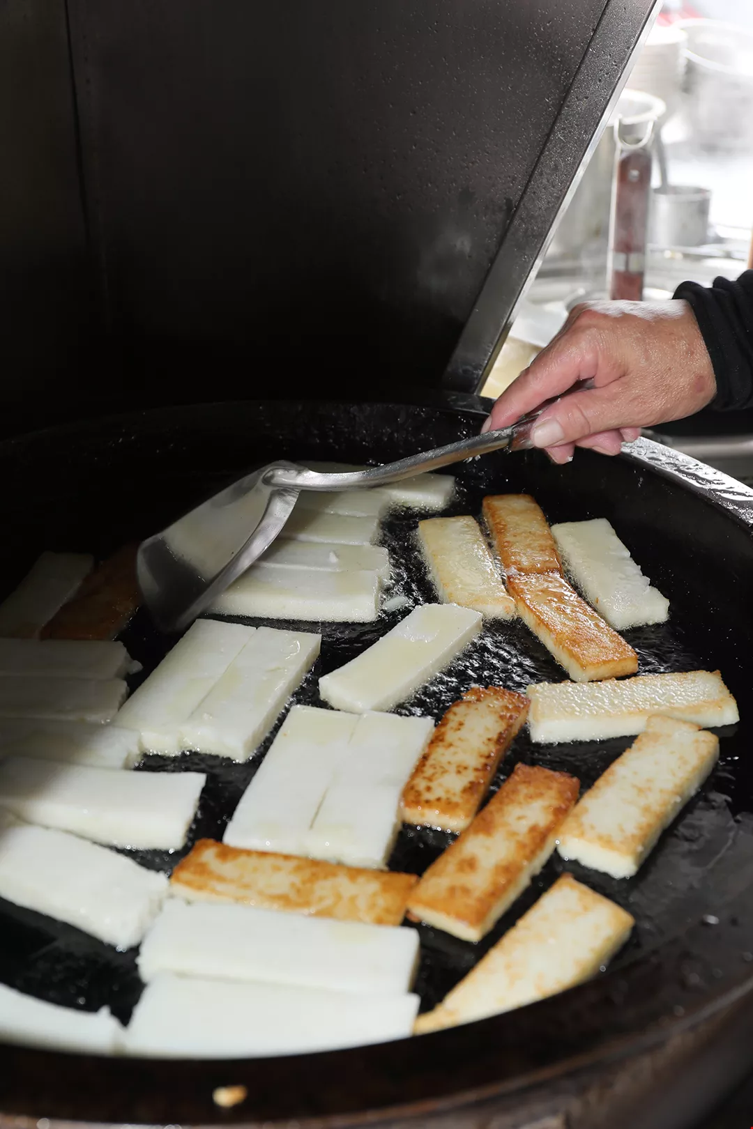 Setiap pagi saat matahari baru terbit, wajan penggorengan di bawah pohon besar mulai mengeluarkan suara desis “cesss”. Potongan demi potongan kue lobak digoreng hingga keemasan oleh Lai Kuo-cheng sang pemilik, sementara istrinya, Hsieh Pei-chun, sibuk menyajikan saus dan membungkus pesanan. Kue lobak yang renyah di luar dan lembut di dalam, dimakan bersama minuman sari beras buatan sendiri, ditambahkan lagi dengan sup darah babi atau sup miso campur, menjadi sarapan bergizi dan penuh energi.