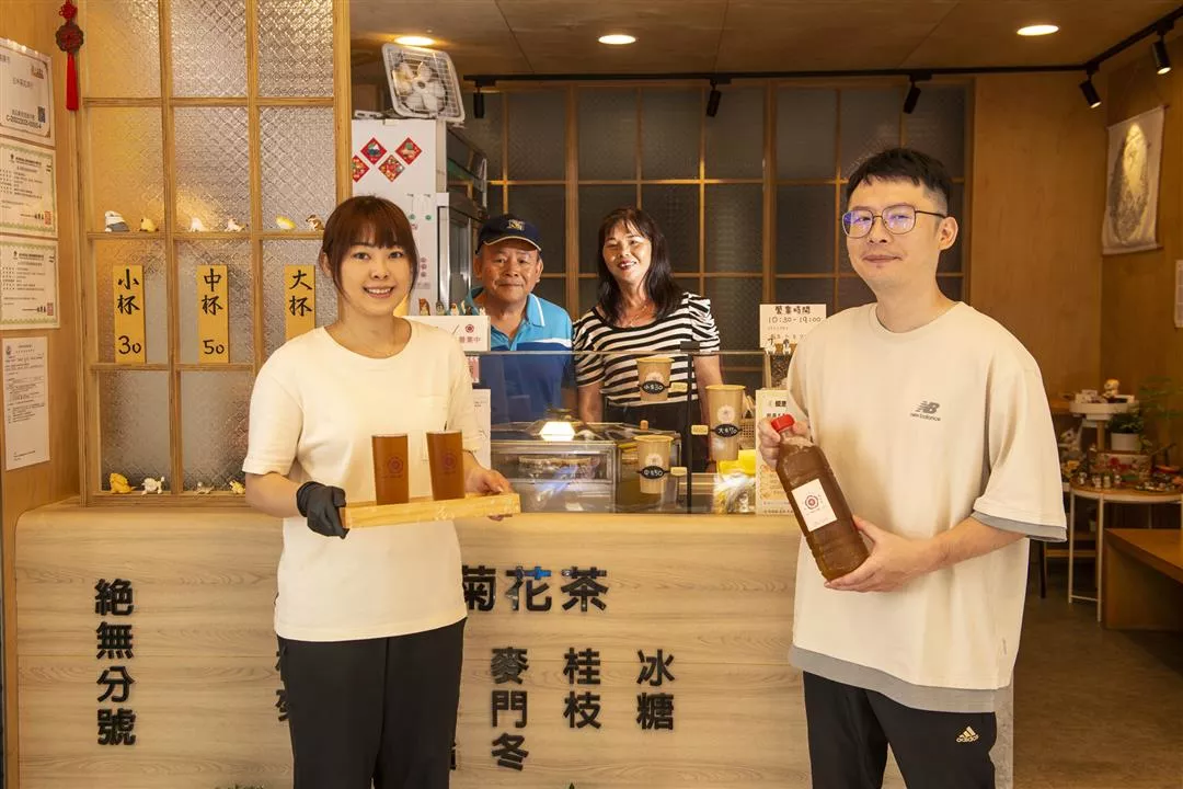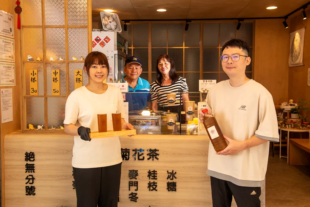 Tseng Yi-he (kanan), Lai Yi-hua (kiri) membuka usaha Wu He, bersikeras hanya menjual teh krisan untuk meneruskan cita rasa lezat dari Tseng Shi-lin beserta istri (barisan belakang kiri, kanan), agar lebih banyak orang bisa menikmatinya.