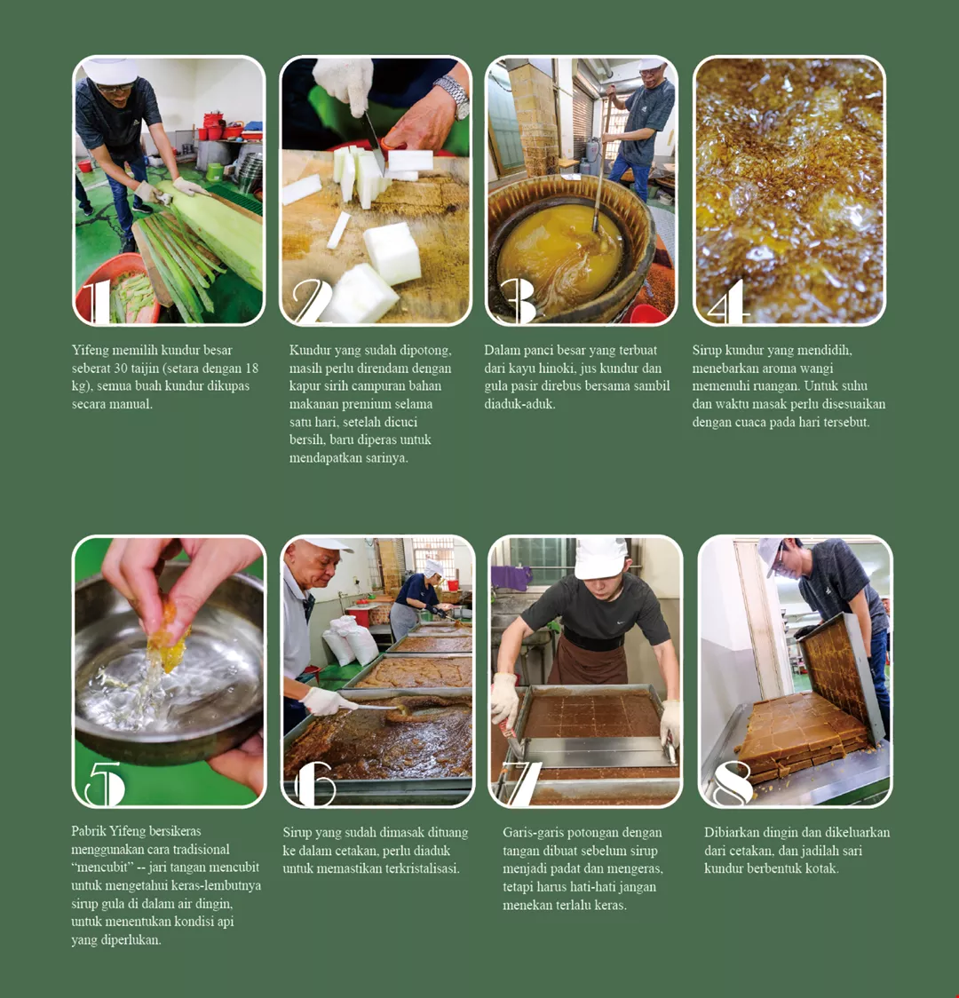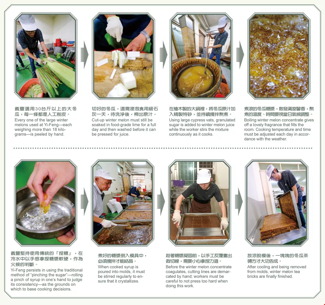Berbeda dengan bongkahan teh kundur yang ditambahkan dengan zat pewangi yang dijual di pasaran, bahan dasar yang digunakan pabrik Yifeng adalah kundur, gula pasir, dan air. Bagaimana cara mengolah bahan dasar yang sederhana ini untuk menghasilkan aroma wangi? Tentunya ini sangat mengandalkan keterampilan juru masak. Dengan tetap mempertahankan teknik pembuatan tradisional, pabrik Yifeng menggunakan tong kayu besar yang terbuat dari kayu hinoki dan besi kasar. Kundur yang diperas menjadi jus kundur dan gula pasir dimasukkan ke dalam tong berisikan air mendidih, dan terus diaduk tanpa berhenti hingga butiran gula meleleh, bagian tepi panci yang penyok adalah bekas gesekan spatula dalam jangka waktu panjang. Proses memasak satu panci sari kundur memerlukan waktu dua jam, Lin Ke-lie mengibaratkan dengan merawat anak kecil, tidak boleh terlepas dari pandangan mata, menjaganya sambil terus-menerus mengaduk supaya tidak gosong, juga harus memerhatikan perubahan kekentalan cairan gula, mengontrol suhu temperatur dan waktu masak yang disesuaikan dengan kebutuhan.