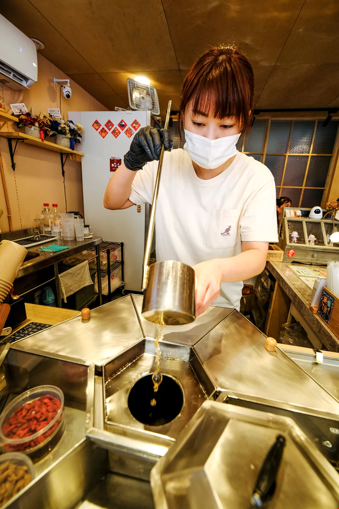 Demi menjaga kualitas, pasangan suami istri ini melakukan semuanya sendiri. Setiap gelas teh krisan diisi dengan cara satu demi satu sendok teh yang diambil dari tong untuk diisi ke dalam gelas. Ada yang menyarankan, mereka bisa mencontoh gerai minuman kocok yang menggunakan termos kran, tinggal membuka kran maka air teh dapat dituang ke dalam gelas. Lai Yi-hua menjelaskan, obat ramuan herbal obat tradisional Tiongkok bisa mengendap, lagipula di dalam tong teh diisi dengan batu es, maka sebelum diambil perlu diaduk-aduk. Selain itu, setiap saat juga perlu mengecek tingkat kemanisan, kadar es baru dapat menjamin agar kualitas minuman tetap konsisten.
