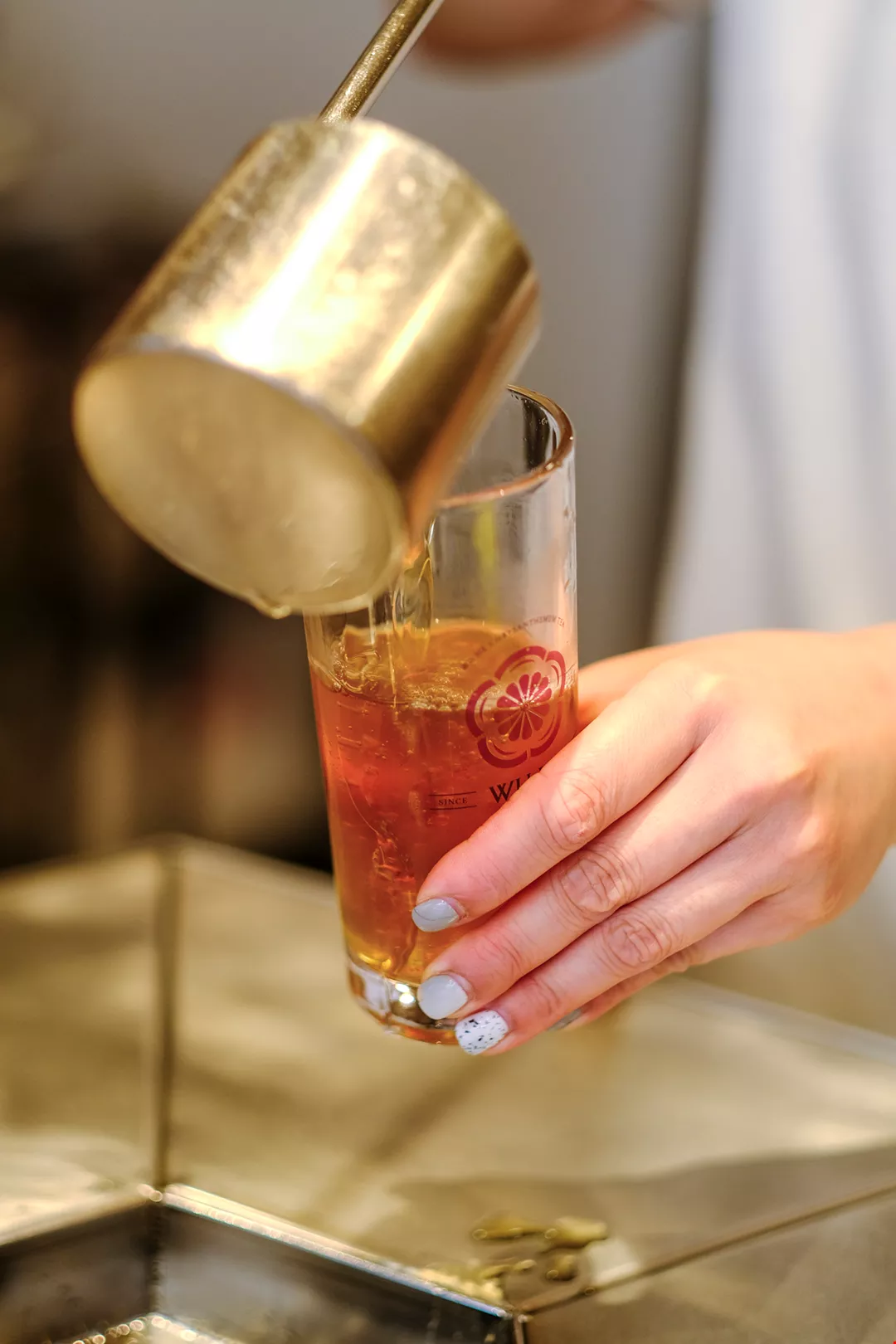 Setiap gelas minuman pelepas dahaga teh krisan Wu He diisi dengan cara satu demi satu sendok, untuk menjamin agar minuman yang dinikmati memiliki cita rasa yang prima.