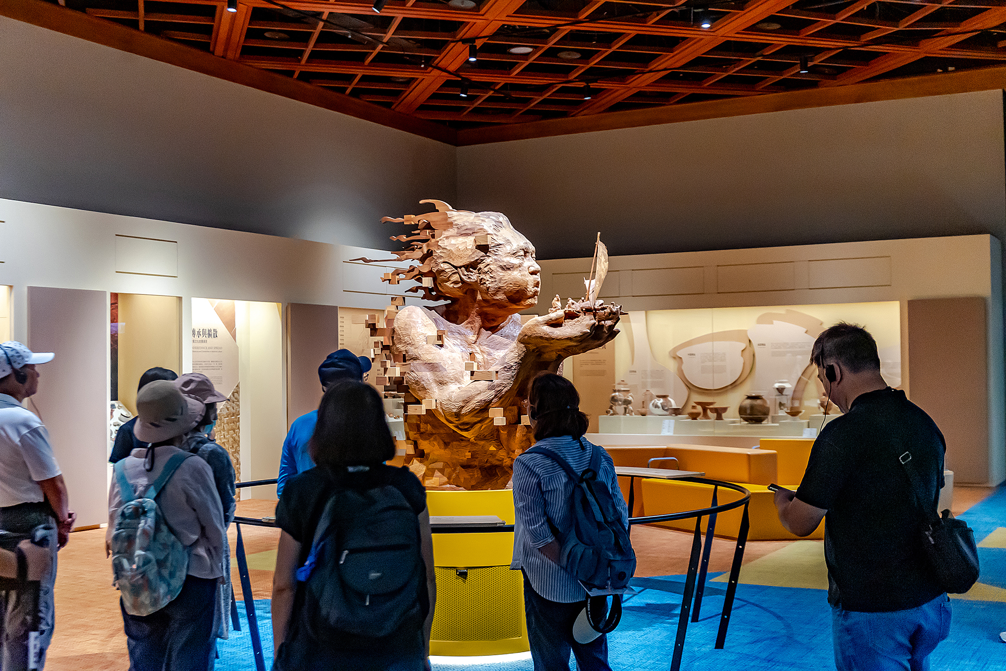 Masyarakat Austronesia adalah struktur dari kelompok orang dan wilayah geografis yang dibangun berdasarkan penggunaan bahasa Austronesia. Namun Fang Chun-wei, Kepala Divisi Pameran dan Pendidikan, memulai ceritanya dari pintu masuk ruang “Austronesia Hall”, kurator menggunakan proyeksi Mercator untuk menampilkan peta dunia, hanya dengan mengarahkannya ke atas bagian timur matahari terbit. Begitu sudut pandang berubah, kami melihat daratan bercampur lautan, pulau-pulau yang ditempati masyarakat Austronesia tersebar di Samudra Pasifik, bagaikan gugusan mutiara.