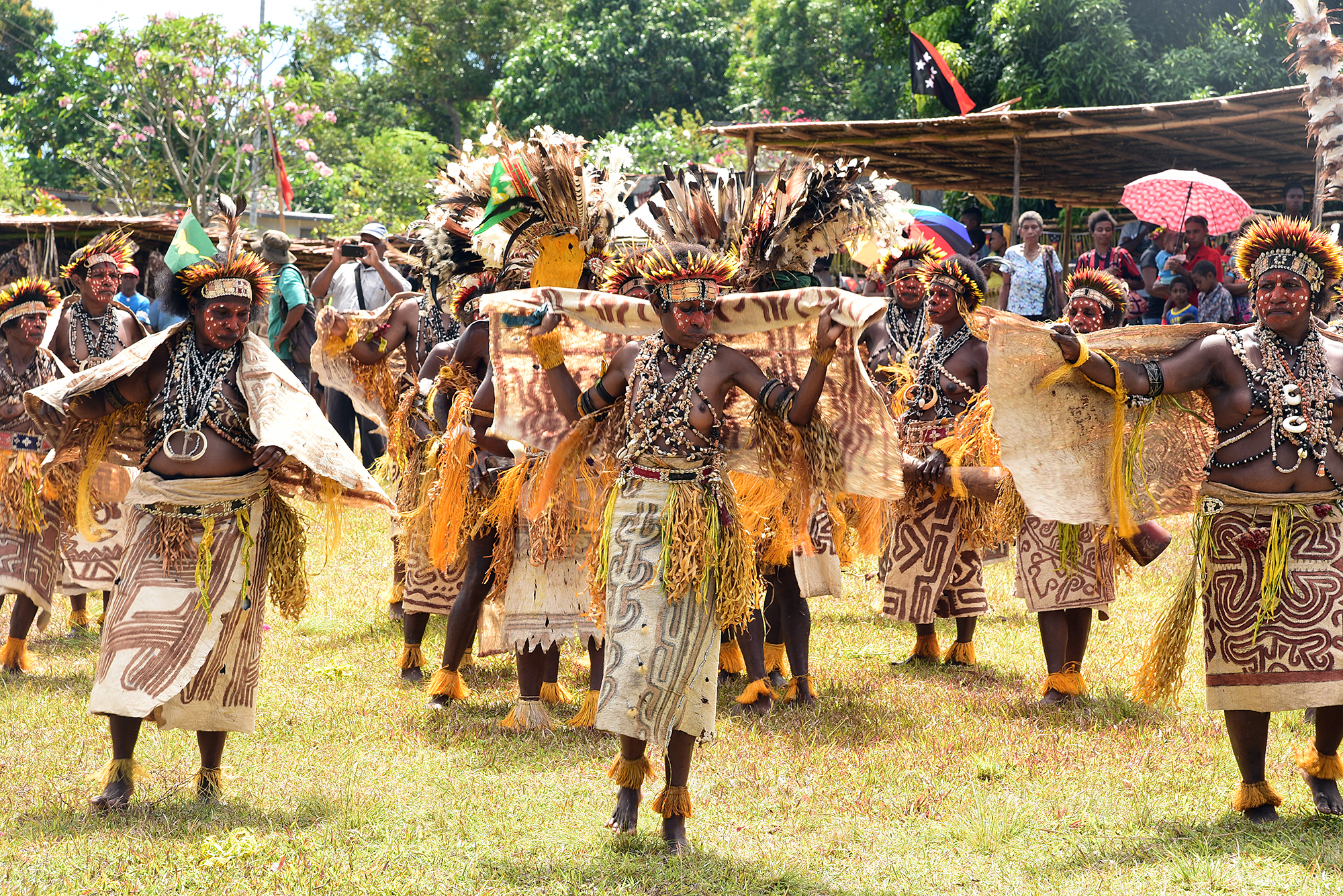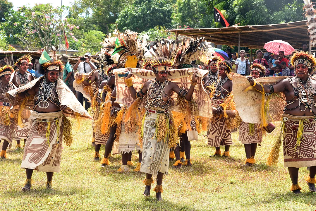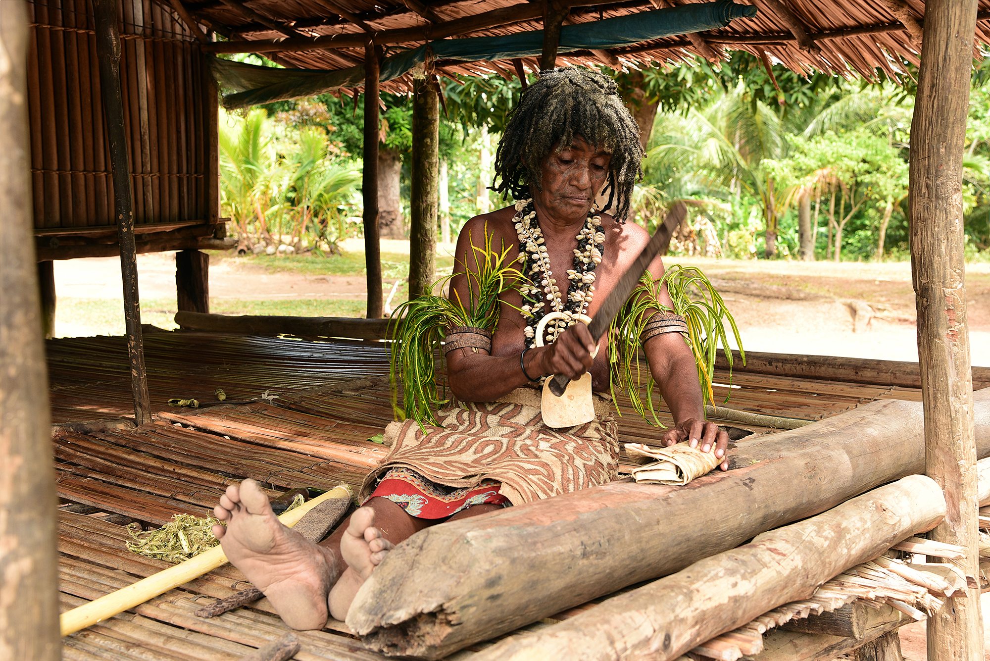 Bahan kain kulit pohon yang ada di Kepulauan Samudra Pasifik adalah daluang, memberikan petunjuk penting kampung halaman paling awal dari masyarakat Austronesia. Foto ini memperlihatkan warga Papua Nugini memukul kulit pohon untuk membuat kain dan mengenakan busana kain kulit pohon saat melakukan ritual. (Foto: Chung Kuo-fang)