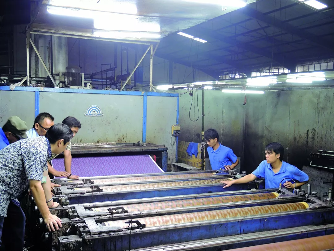 Ke Bai-quan (kiri bawah), putra pertama Ke Chao-chih, di pabrik percetakan kain membantu menyelesaikan masalah mesin dan membimbing standar prosedur kerja mesin kepada karyawannya. (foto : Ke Chao-chih)