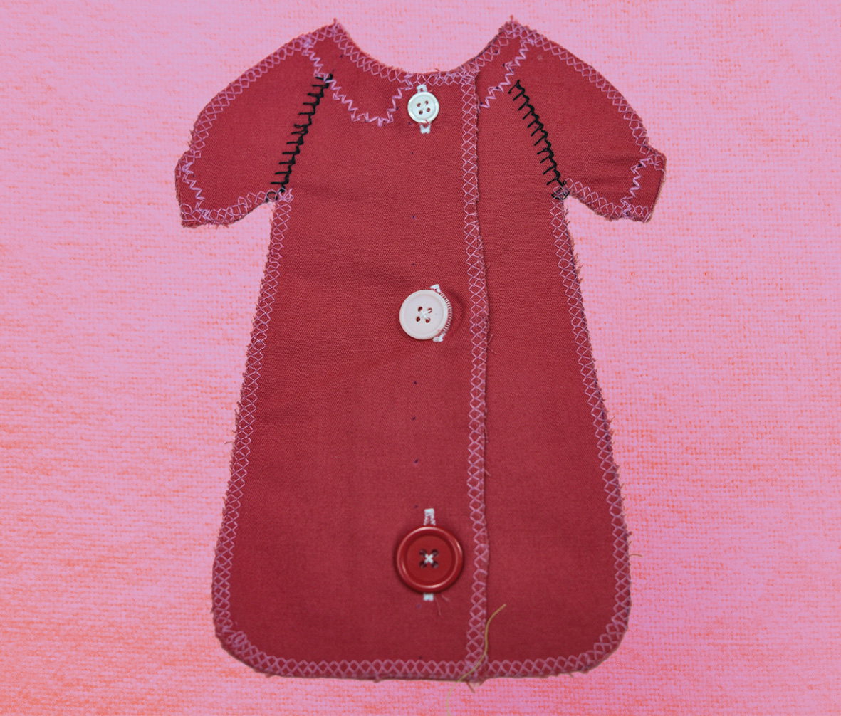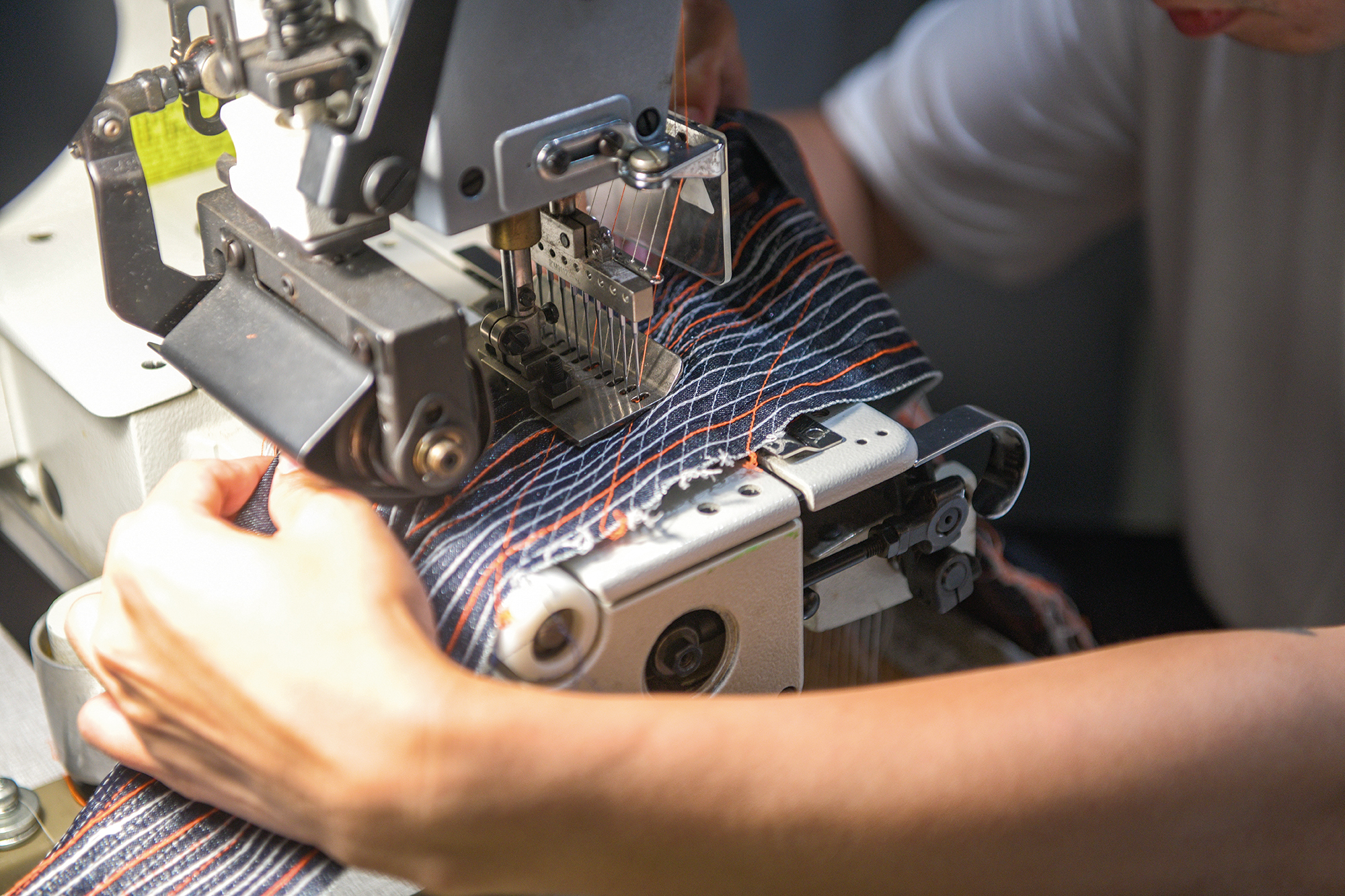 Mesin jahit 12-jarum ini biasanya digunakan untuk menjahit elastik, tapi melalui penggunaan keragaman warna dan cara jahit berlainan, seorang desainer dapat menciptakan pola dekoratif yang indah.