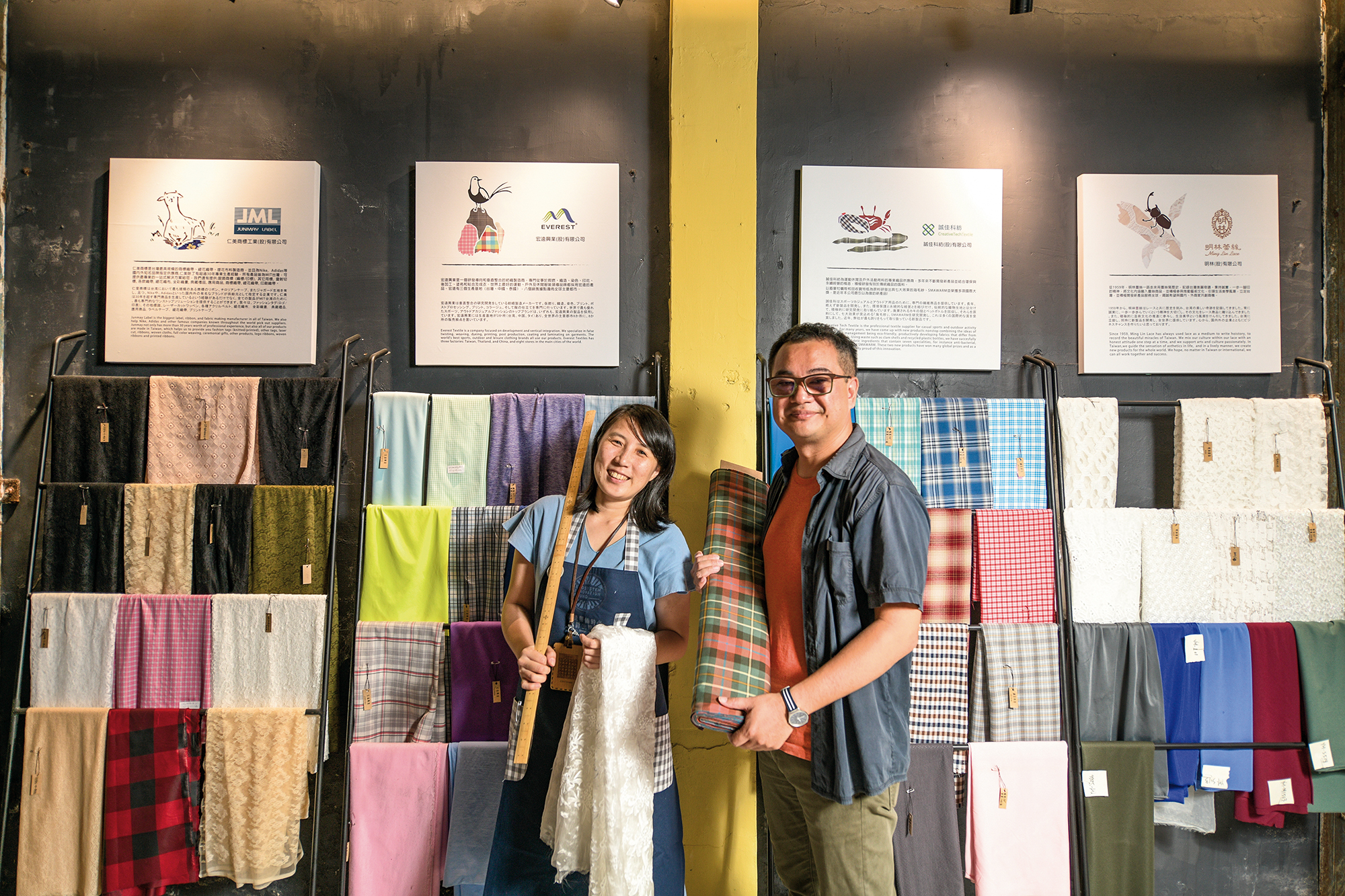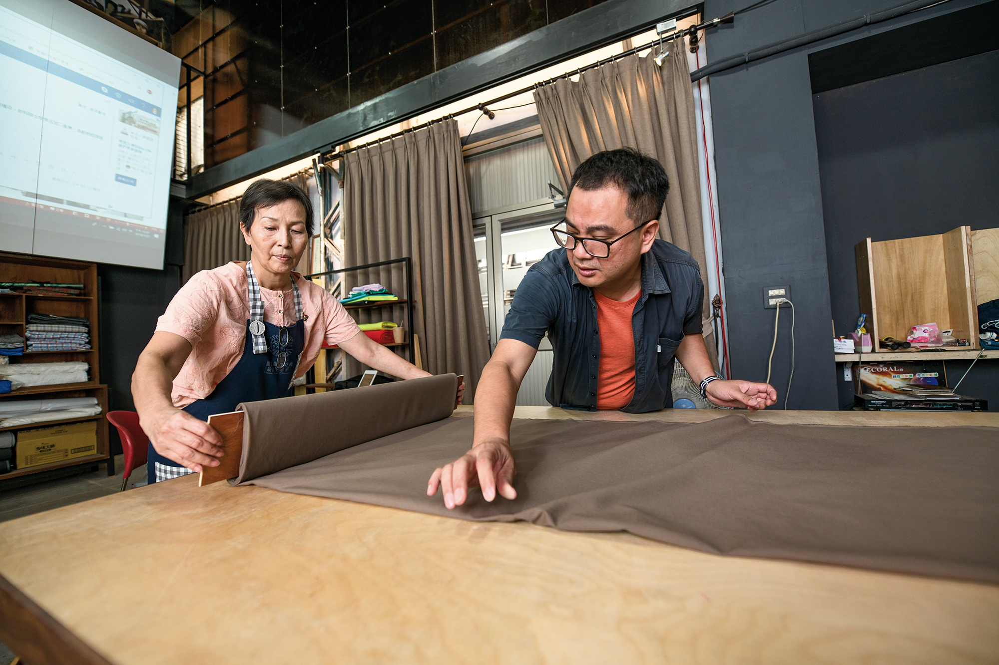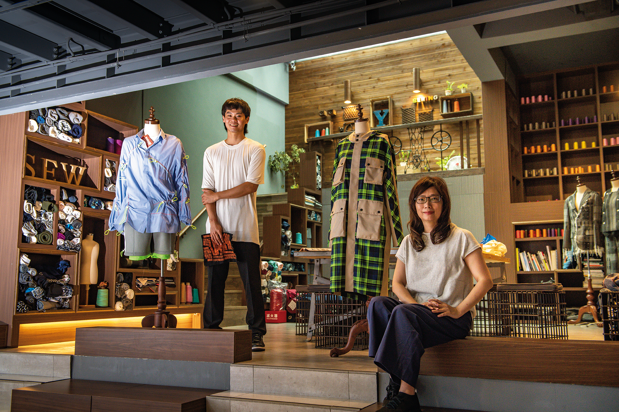 Di salah satu pojok, dua potong pakaian tergantung di atas manekin baju. Perancang busana Joe Chan menciptakannya dengan menggunakan limbah kain, dan dengan bantuan Kaulin, produk karya ini tengah disiapkan untuk dikirim ke Las Vegas untuk mengikuti pameran bersama sembilan desainer Taiwan lain.