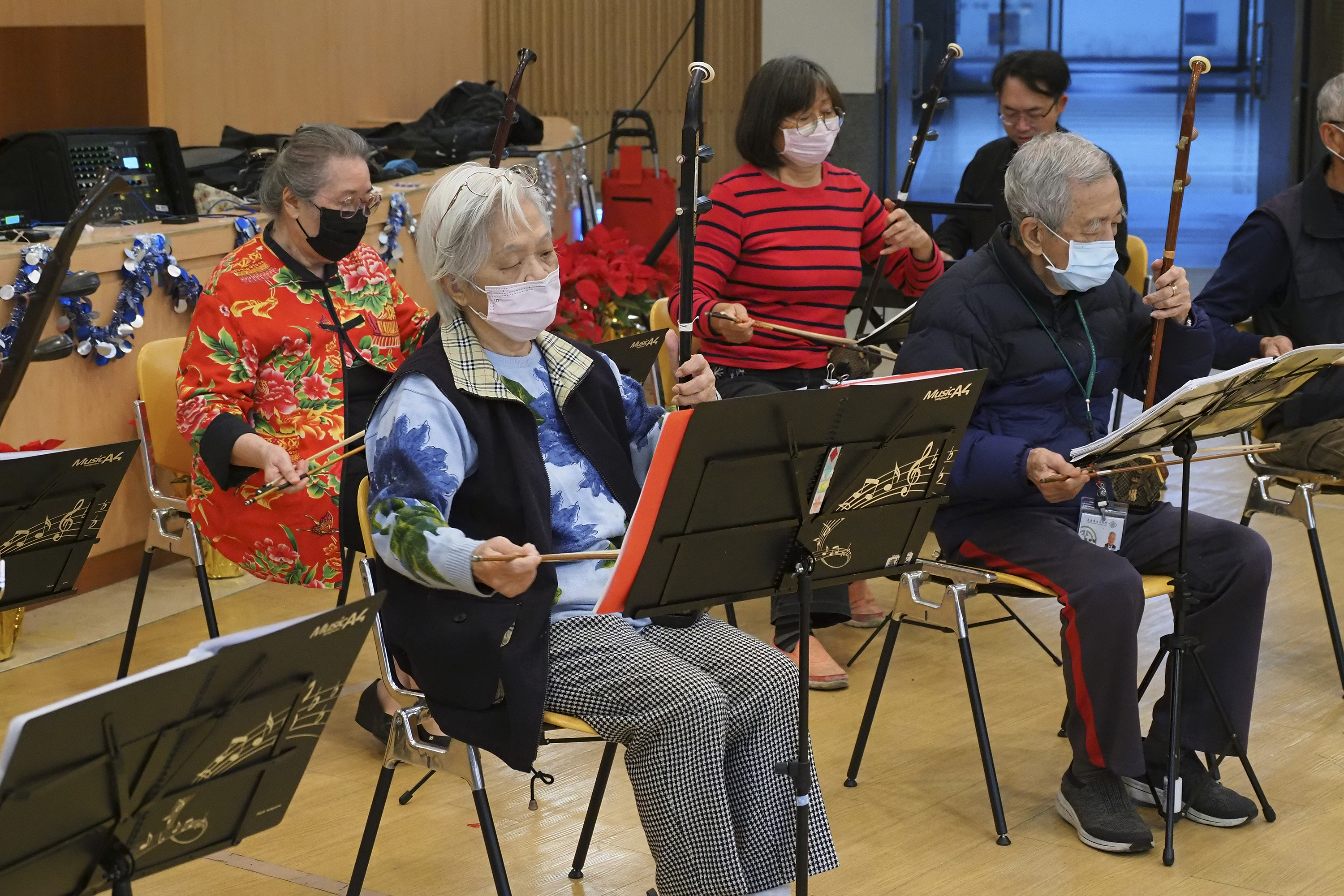 Penghuni Desa Pemeliharaan Kesehatan belajar memainkan erhu. (Foto: Jimmy Lin)