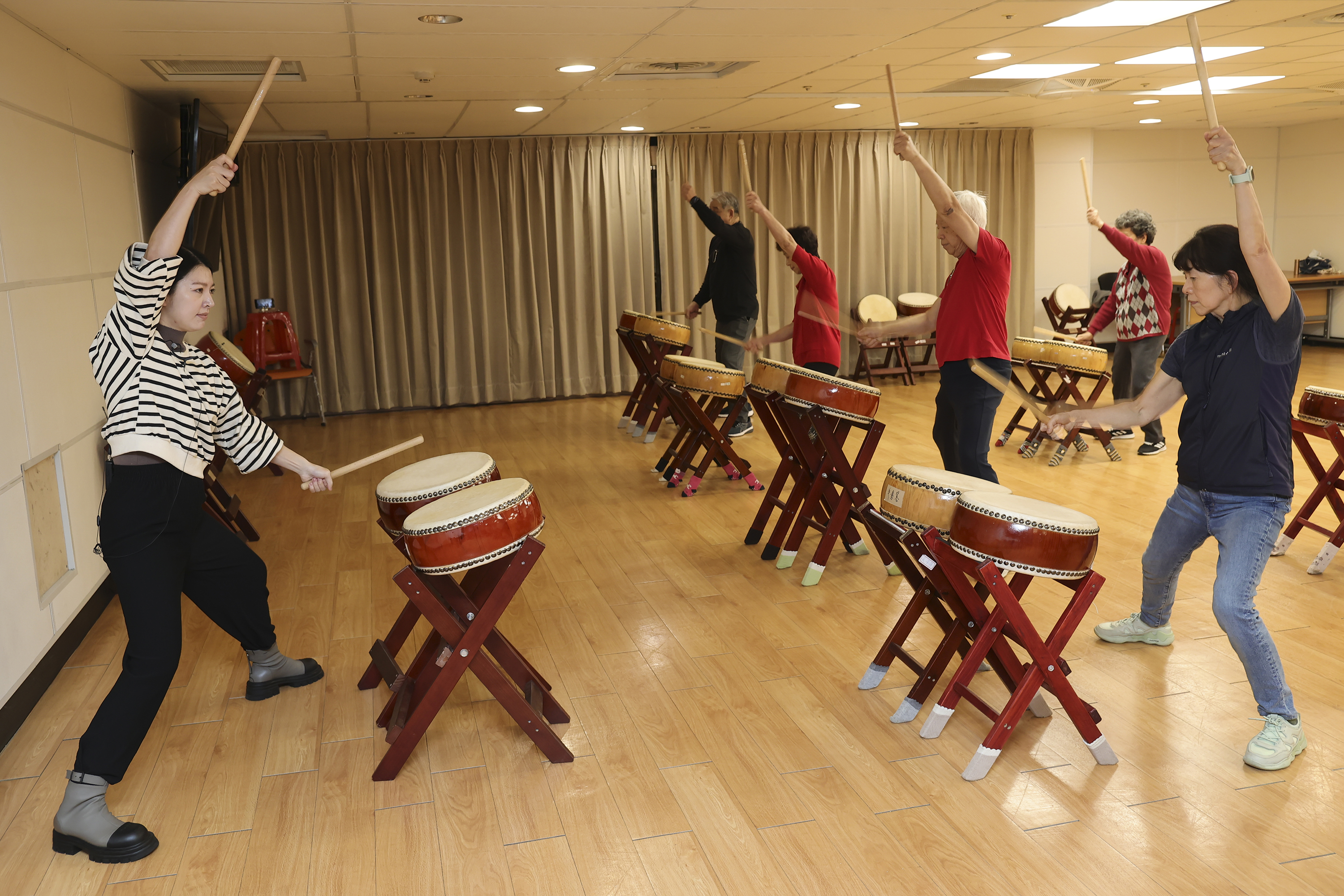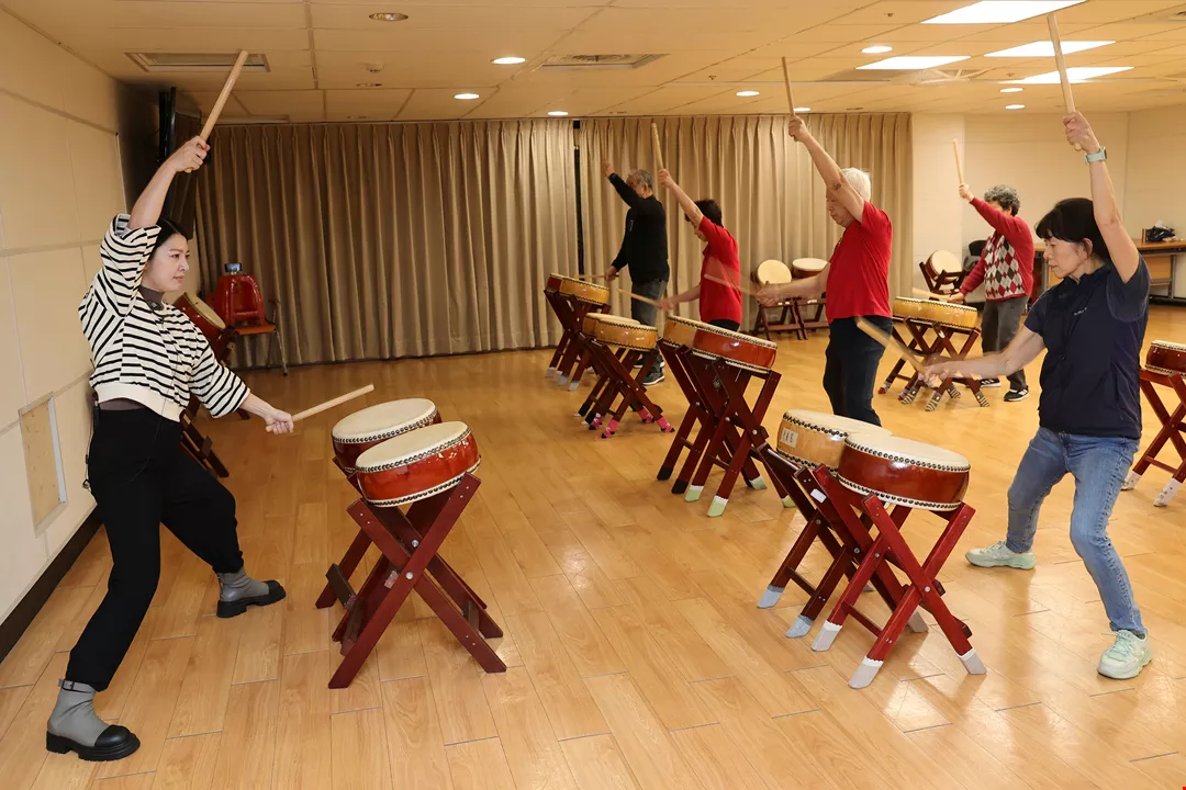 Penghuni Desa Pemeliharaan Kesehatan dengan penuh semangat menabuh drum dalam pertunjukan penutup kelas Taiko.