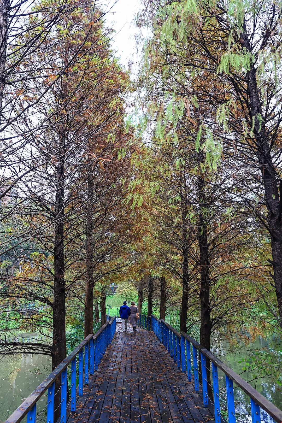 Chang Gung Health and Culture Village menanam seratus ribu pohon. Pada musim dingin, pohon taxodium distichum berubah menjadi merah, menarik pengunjung untuk menikmati pemandangan dan mengambil foto. (Foto: Jimmy Lin)