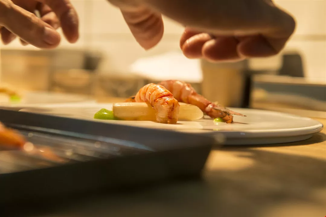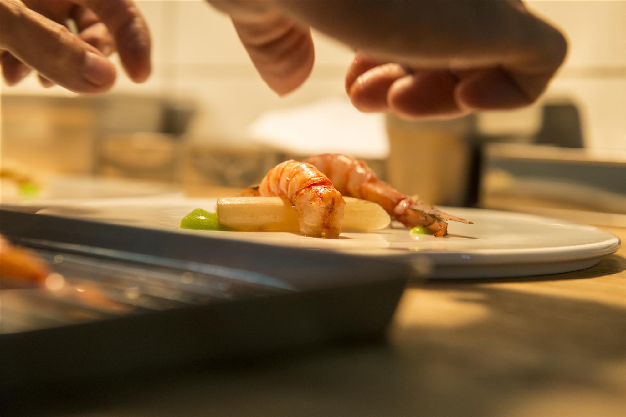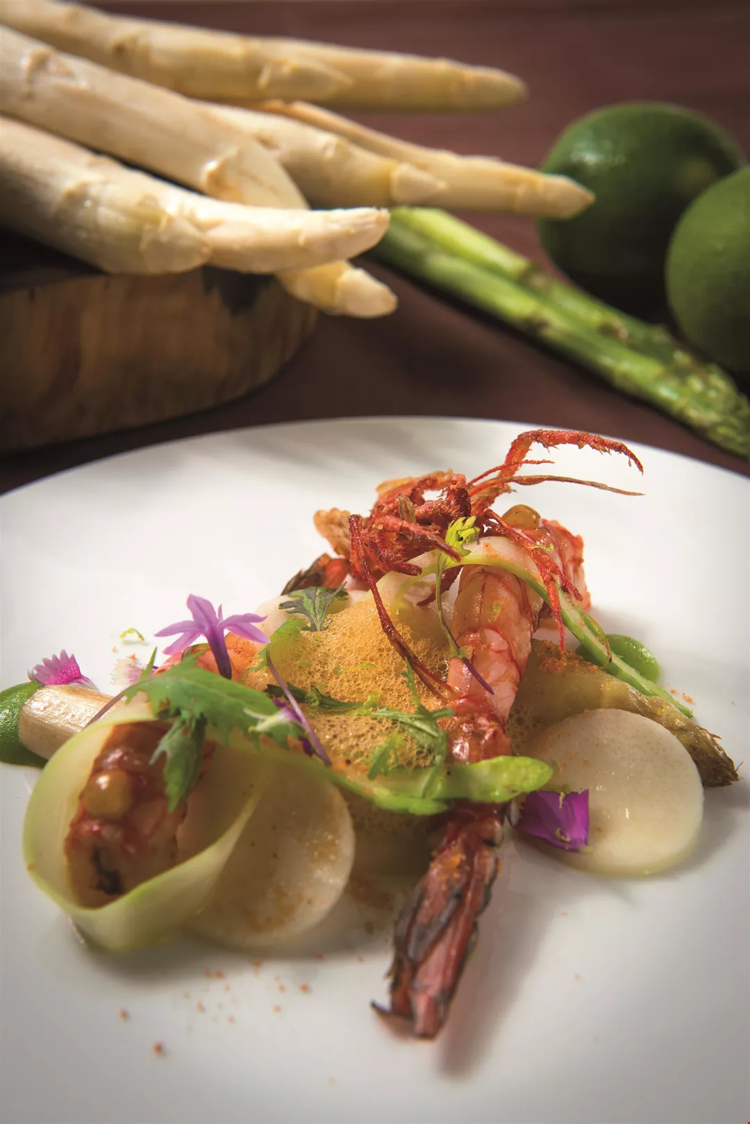 Salah satu sajian makanan Hero Restaurant yaitu “Udang lokal, asparagus Yunlin, karasumi, bubur kelopak bunga Lili”.