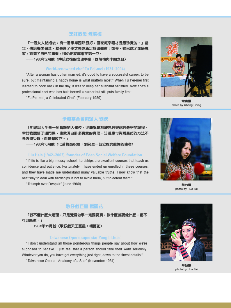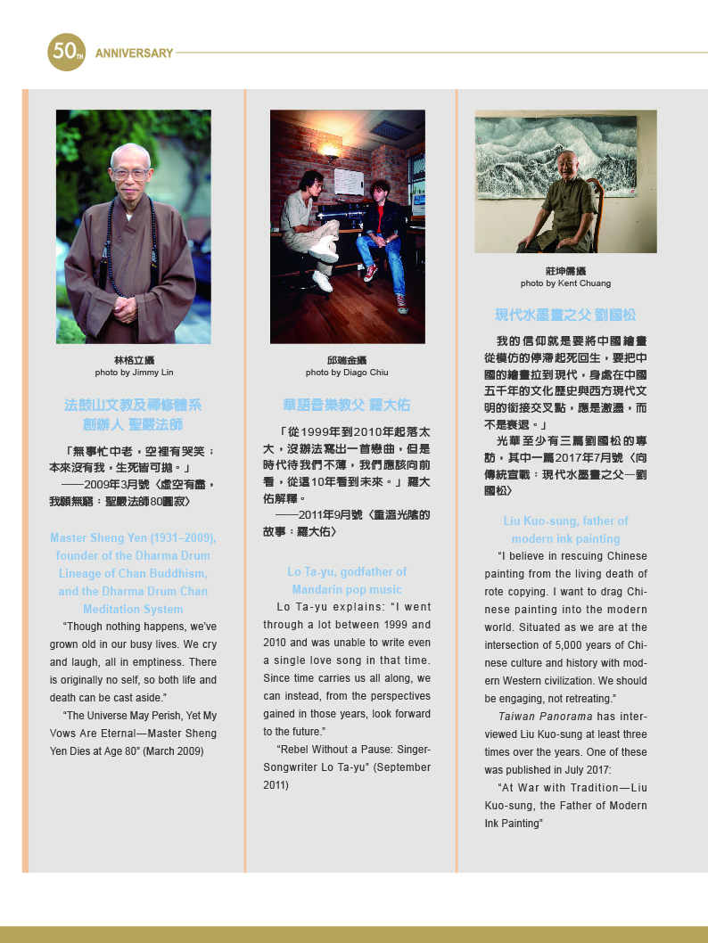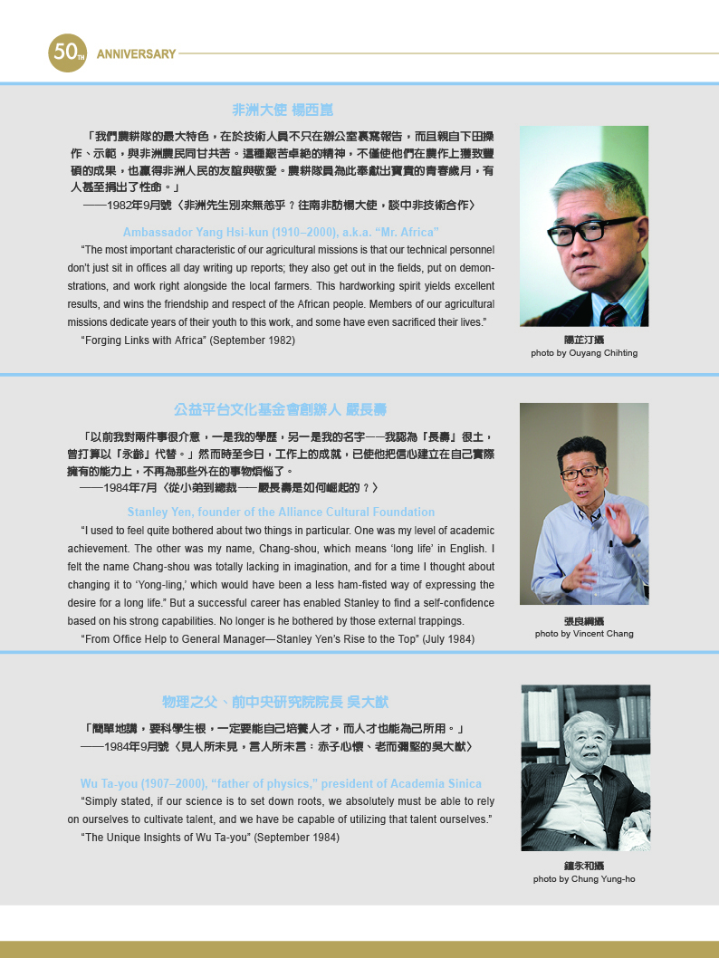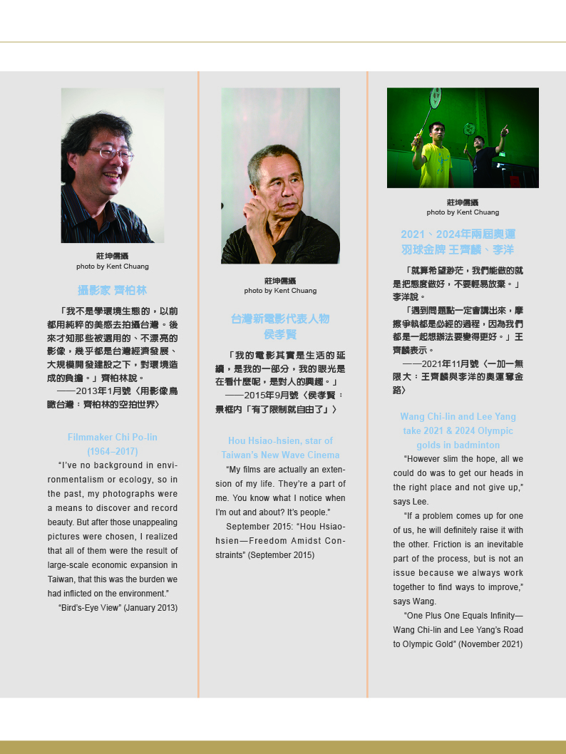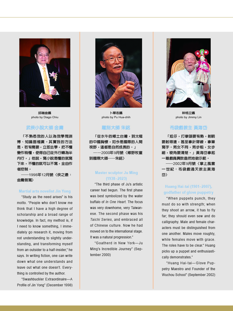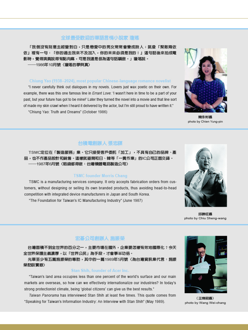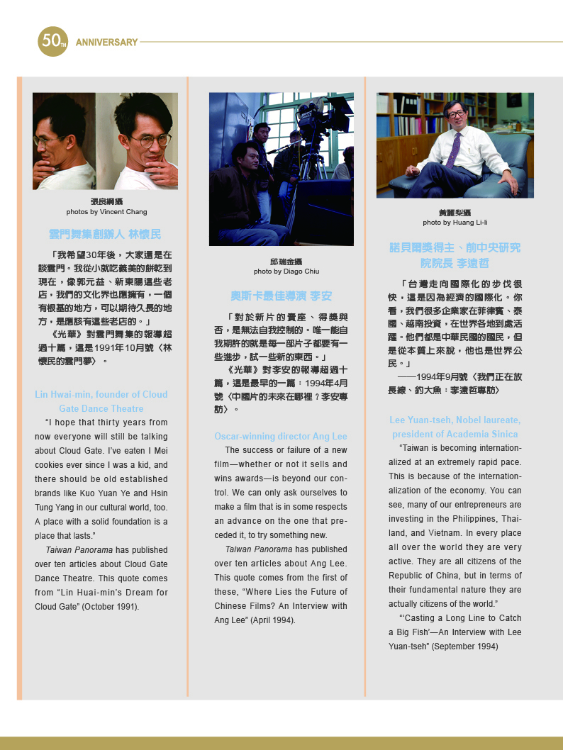 光華50.名人語錄 大人物說過的話 文‧曾蘭淑 圖‧外交部圖庫資料 2025 12月 EN 日本語 分享: 李遠哲、張忠謀、林懷民、李安,這些家喻戶曉的人物,都曾在初出茅蘆時,在《台灣光華雜誌》訪問中,留下他們為台灣社會發展奉獻的身影。 . 關鍵字: 光華50 名人專訪 科技領袖 奧運金牌選手 華語音樂 偉大金句 台灣傑出人物 台灣國際形象 藝術文化名人 勵志名言 歷史 人物 產業 賽事 藝術 音樂 家庭 分享: