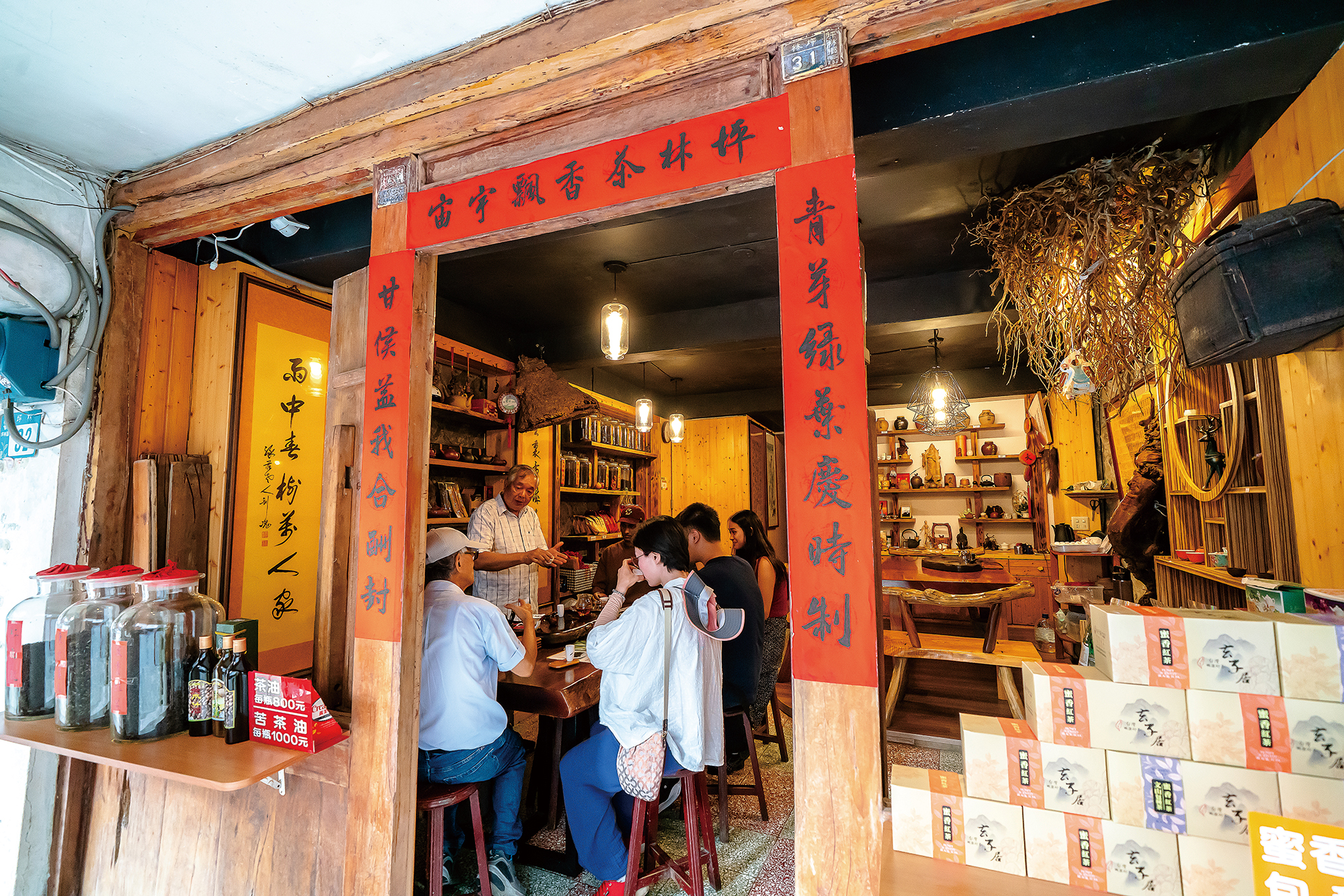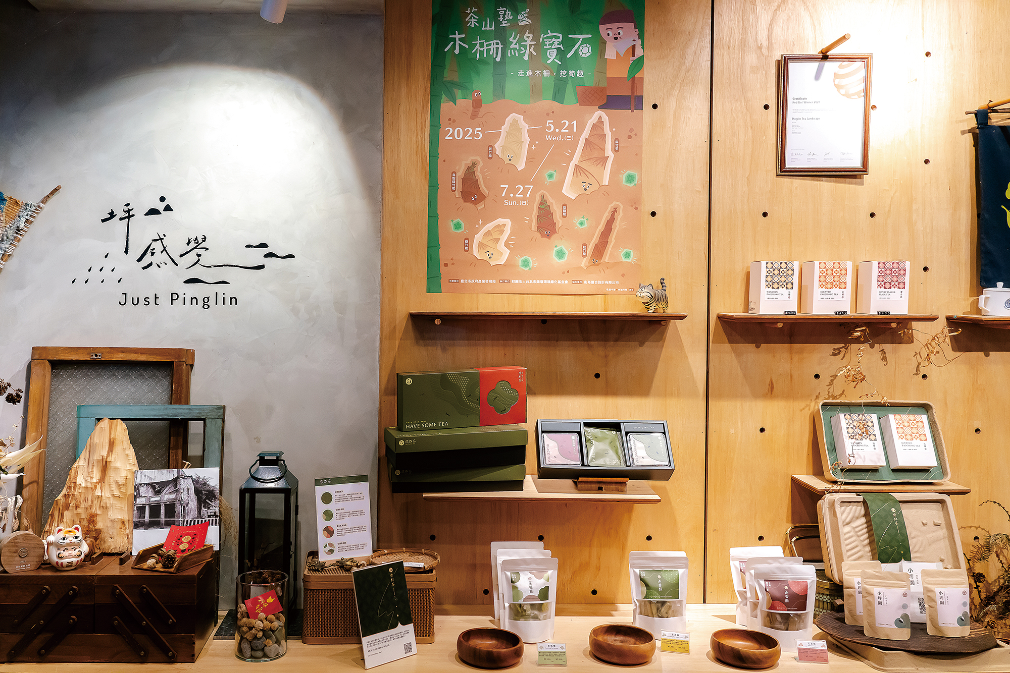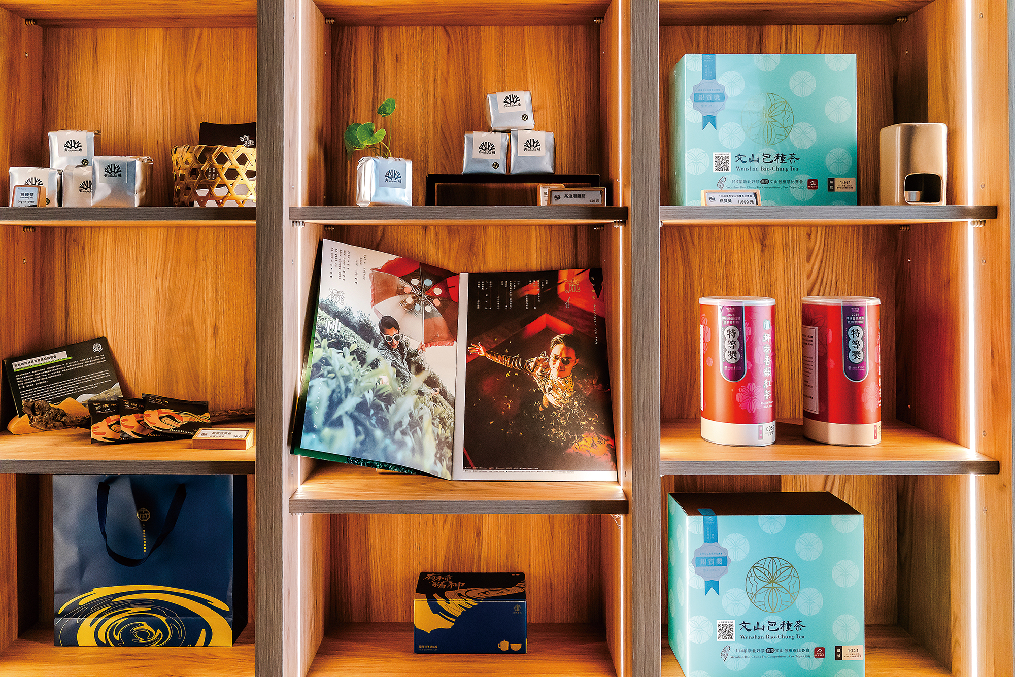 架上陳列著時髦、富設計感的包種茶產品,以年輕世代的新思維,吸引消費者的眼光。