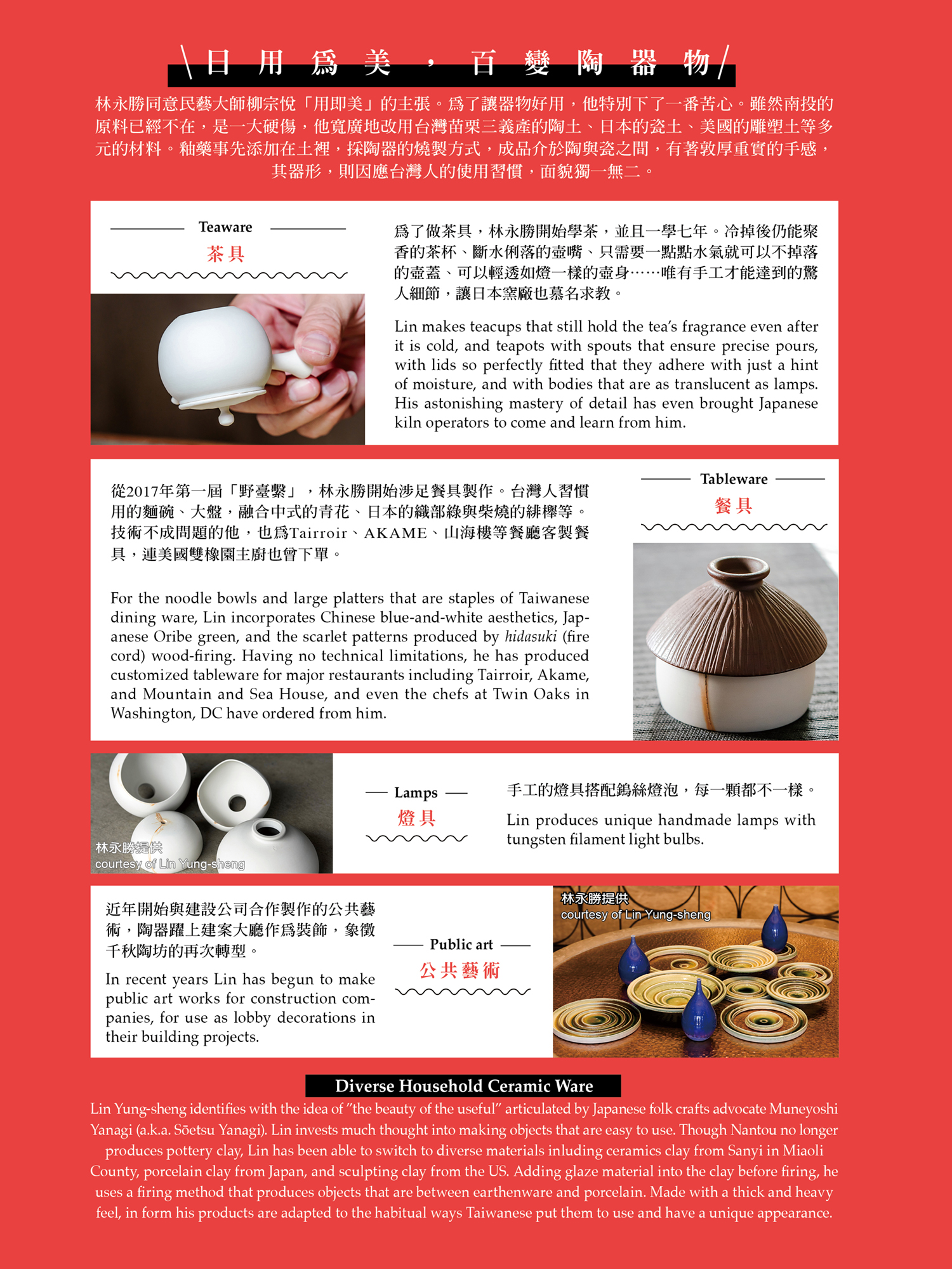 對於技巧純熟的他而言,「重點不在於要用什麼樣的樣貌去呈現(南投陶),而是想要留什麼東西下來。所以,一定要轉型,要符合現代人使用的東西,才有辦法繼續延續下去。」林永勝認為。