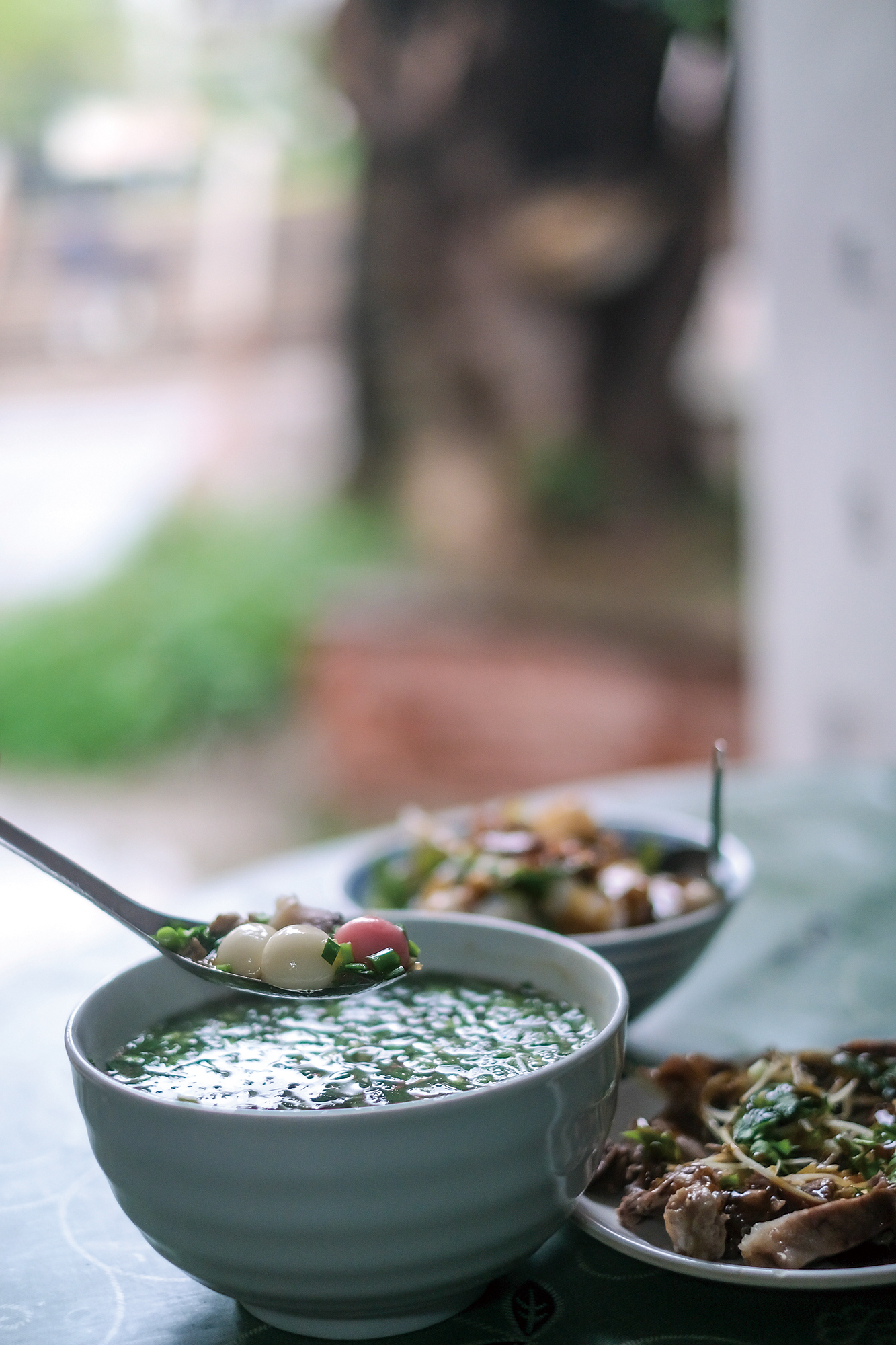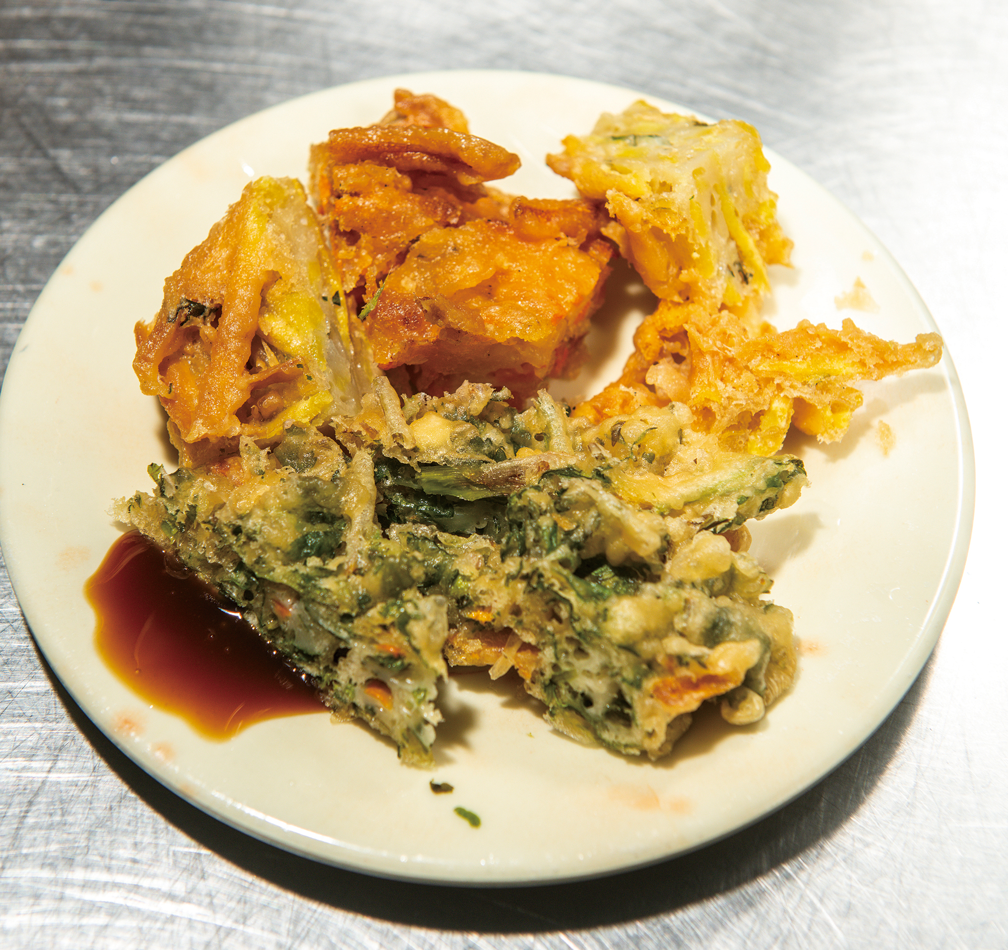 逛完市場,我們跟著黎許傳的腳步,選了間市場的小吃店坐下。在梁記百年老店享用現煮的客家粄條,或是來碗熱騰騰的客家湯圓,店家每日熬煮的清爽湯頭,配上滿滿韭菜與油蔥,嚐上一口身心瞬間舒暢。或可再點上一盤客家婆菜,這是一道將地瓜、芋頭、胡蘿蔔、香菜等,蘸上粉漿炸成可口的蔬菜餅,吃得到蔬菜的甜卻不油膩,豐富味蕾也滿足了胃口。