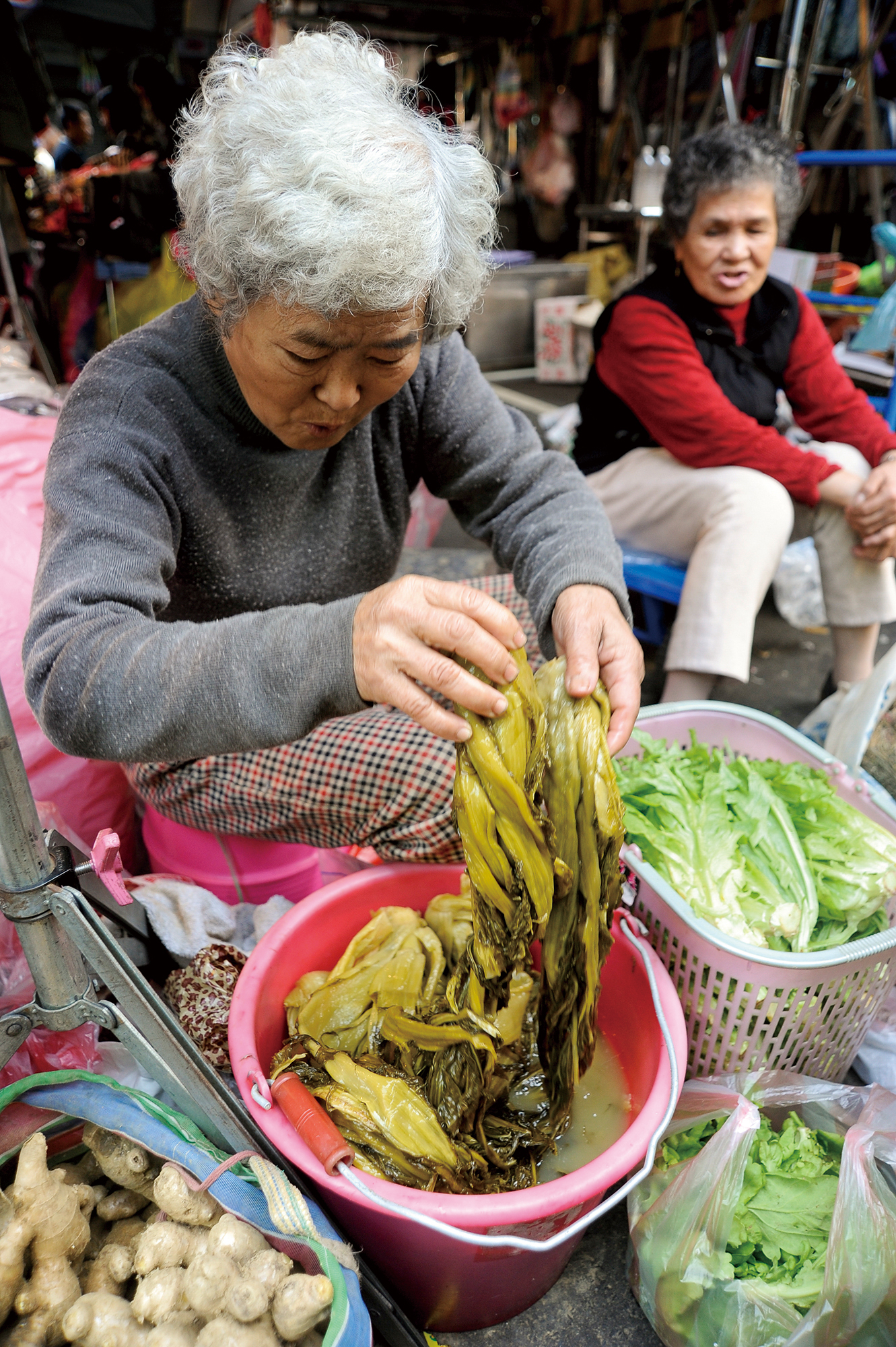 客家人的惜物愛物,不僅體現在料理手法上,更融入食物保存的智慧。竹東市場裡可以找到客家經典醃漬物:酸菜、福菜、梅乾菜,俗稱「芥菜三兄弟」。源自農家對食材的珍惜,將吃不完的新鮮芥菜醃製保存,經一至兩週發酵,成了酸菜;若將酸菜日曬、風乾至半乾,再緊緊塞進玻璃瓶中發酵,就成為福菜;把酸菜曬到全乾,再捆起來陳放,則成了梅乾菜。同樣是芥菜,卻能產生截然不同的風味,不論是酸菜炒肉絲、福菜肉片湯,還是梅乾扣肉,代代相傳的生活智慧,成就了客家料理的靈魂。