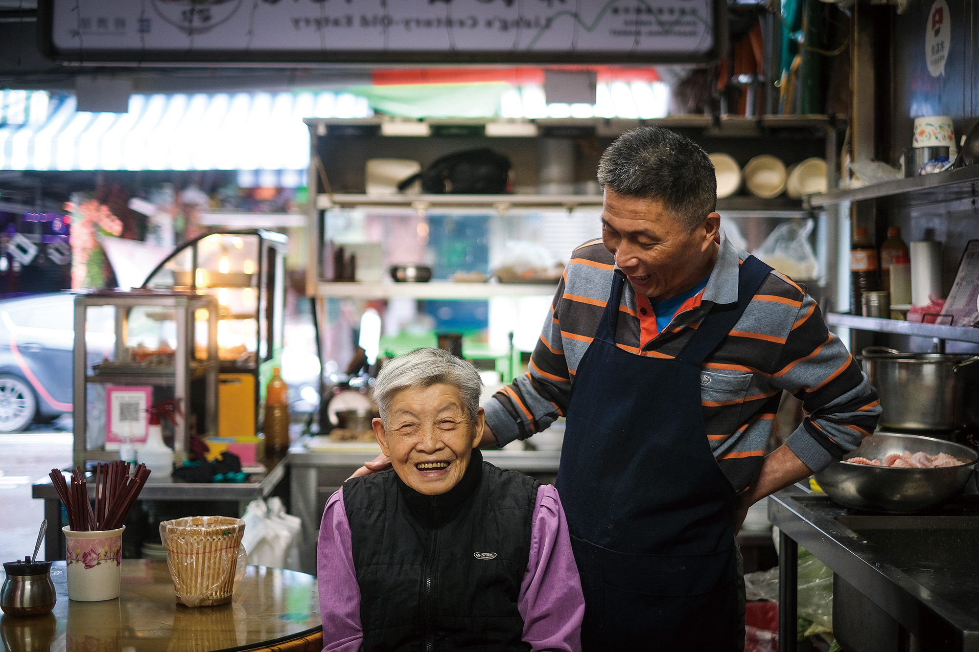 梁烘昌(右)自父母手中接下梁記百年老店,傳承客家的好滋味,90多歲的母親梁胡銀金,身體硬朗,經常到店裡幫忙瞻前顧後。