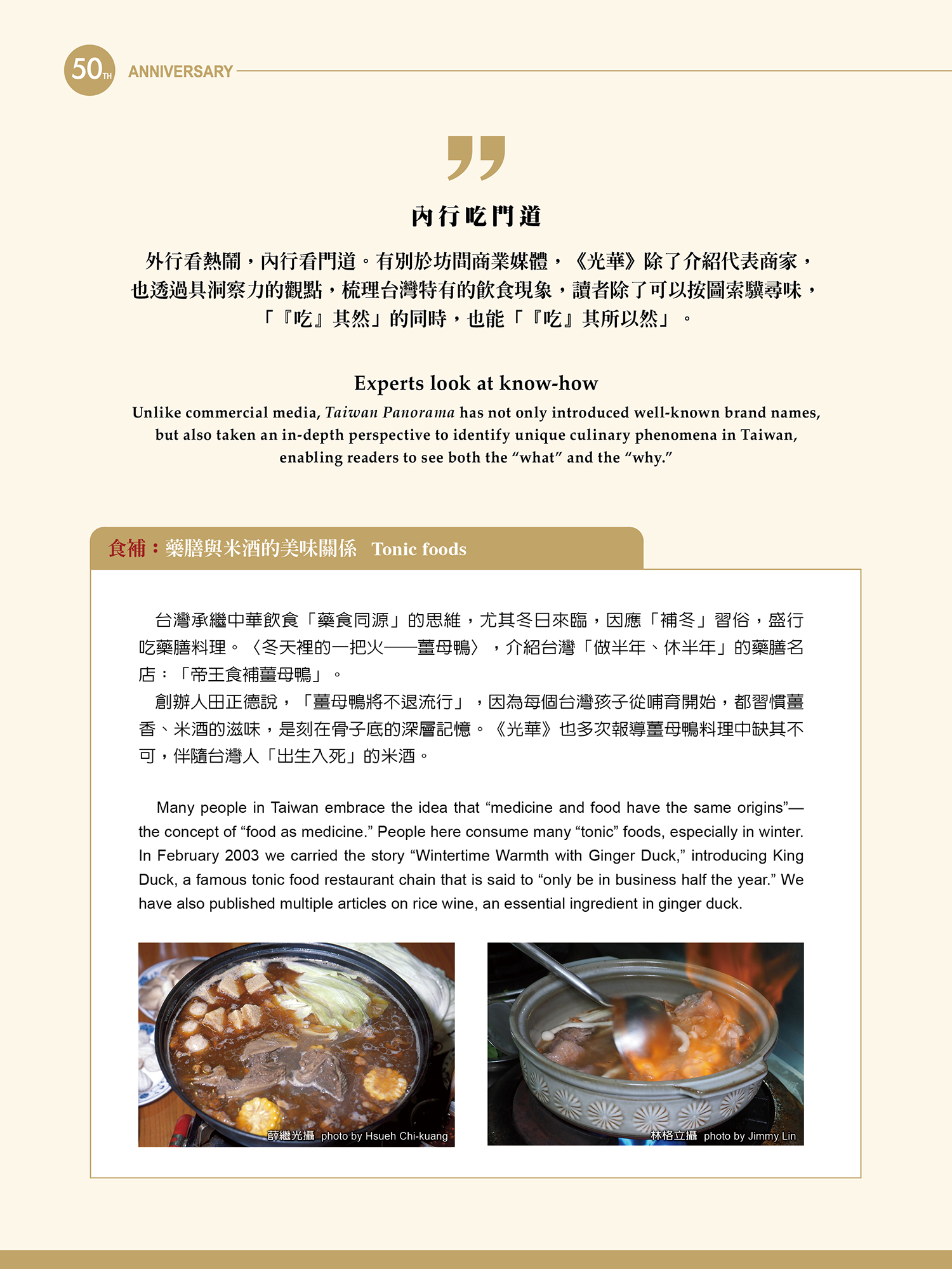 早在1982年4月號,《光華》即以〈古都風味:台南小吃〉,報導石椿臼廣安宮前的「阿憨」虱目魚粥、「再發號」香菇肉羹、沙卡里巴的棺材板、「度小月擔仔麵」等府城老字號。