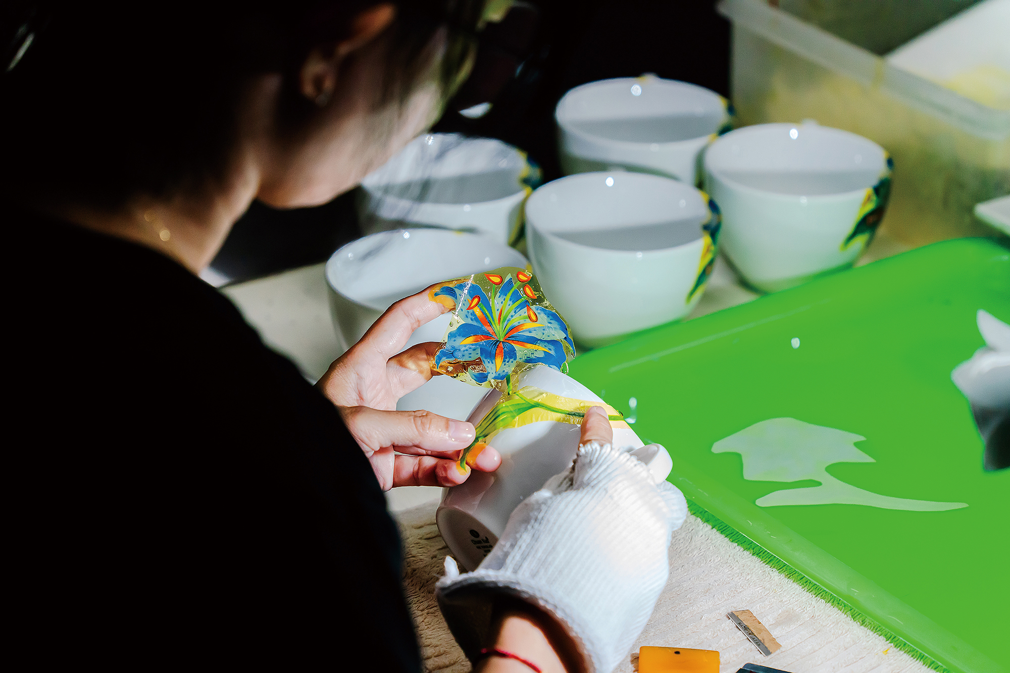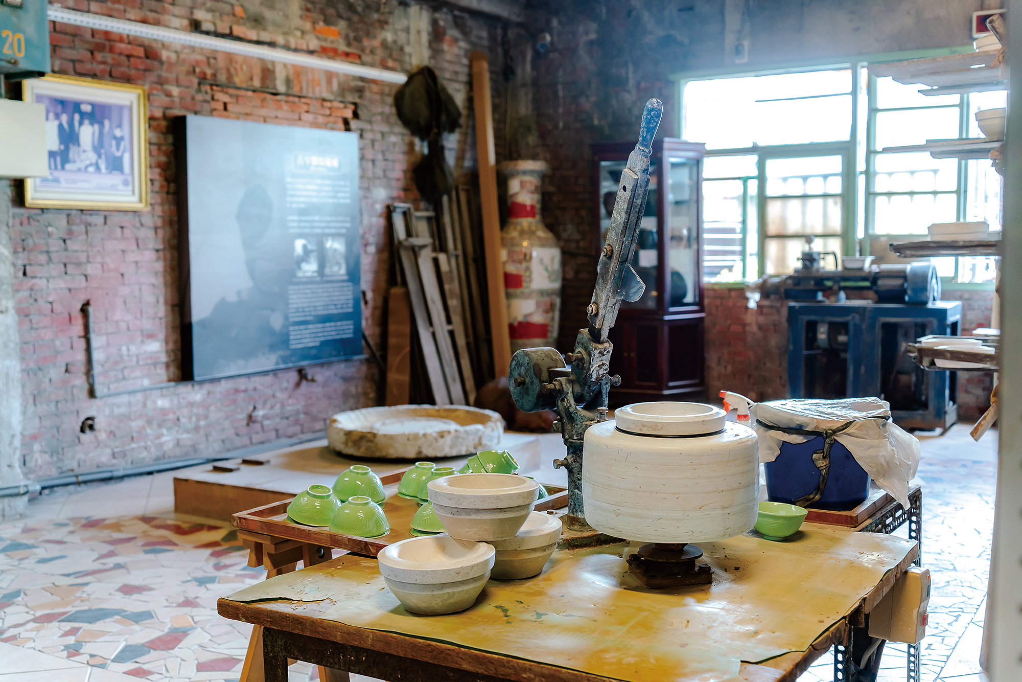 以轉寫印花見長的「新太源」,透過印刷技術能將圖案轉印在陶瓷上。在開放日內踏入工廠,除了少見的機台,還可以看見業者透過獨門技術將畫作印在磁磚上,最後拼貼成為大幅的裝飾品,堪稱神乎奇技。
