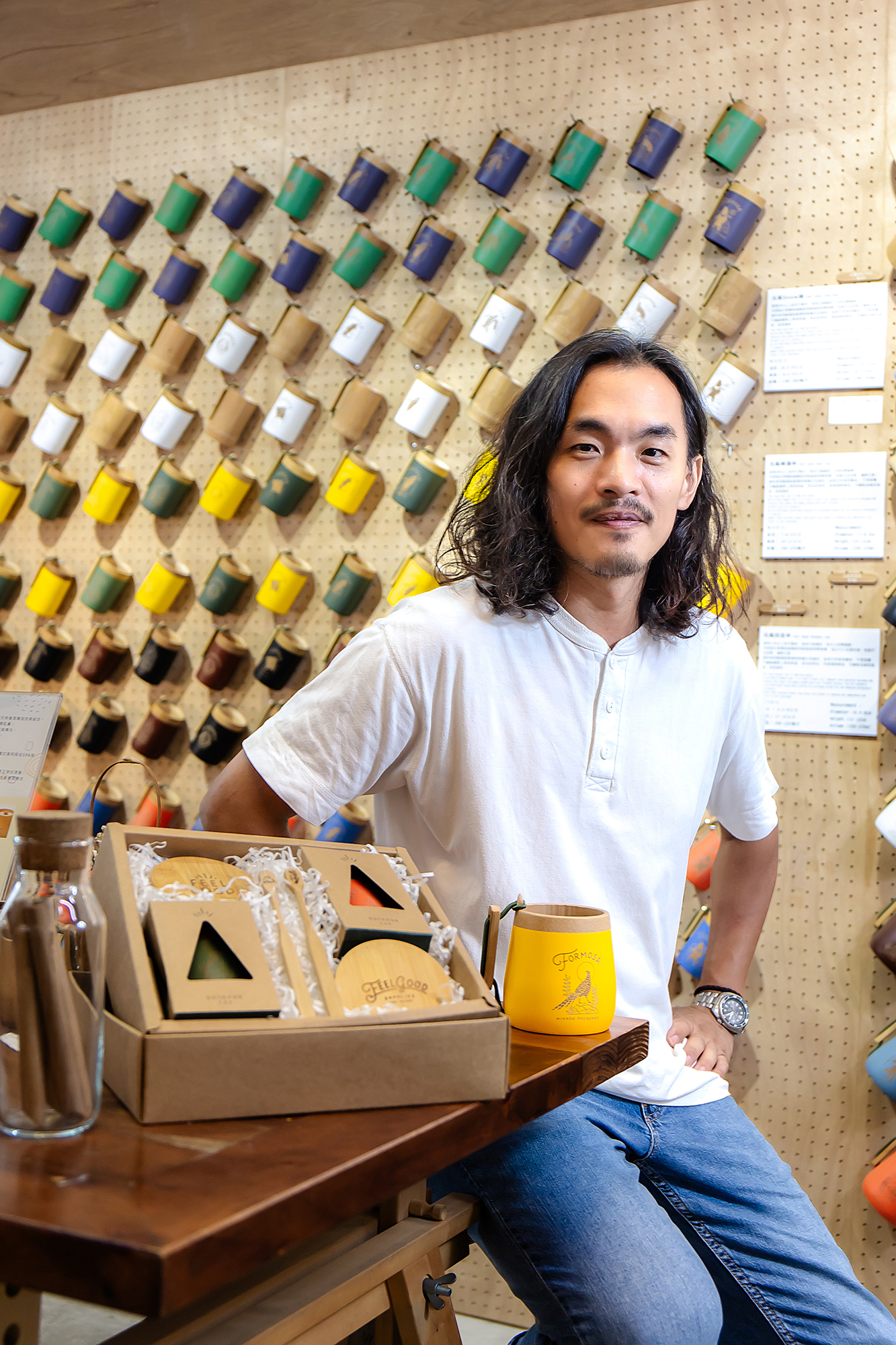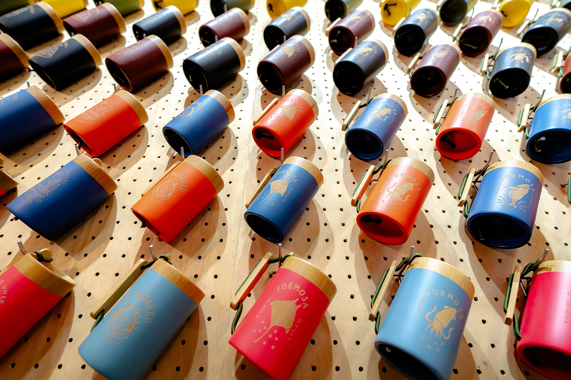 必須經過手工反覆打磨、削切、噴漆等12道工序的竹杯,則有著瑩潤的手感以及飽滿的色彩。