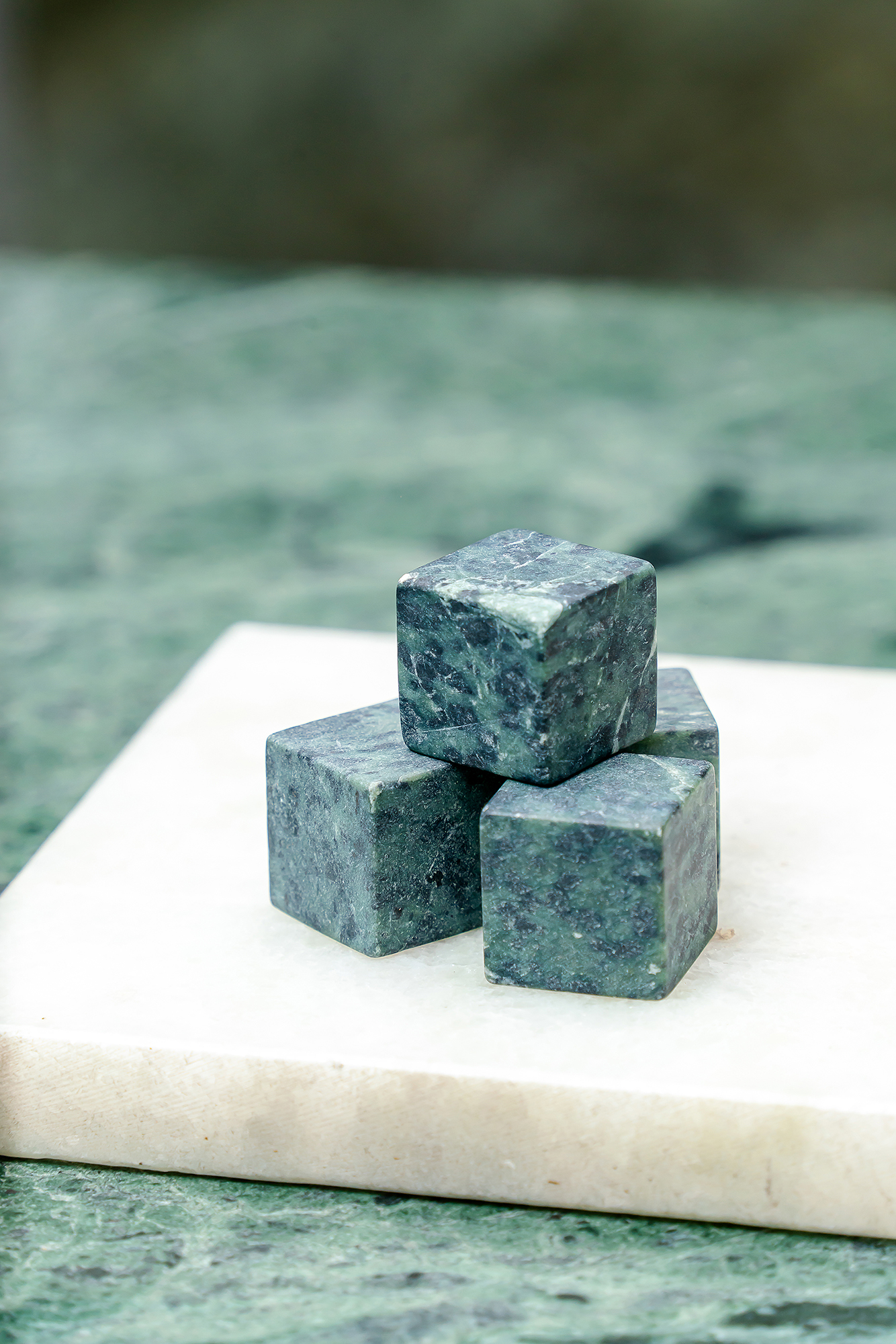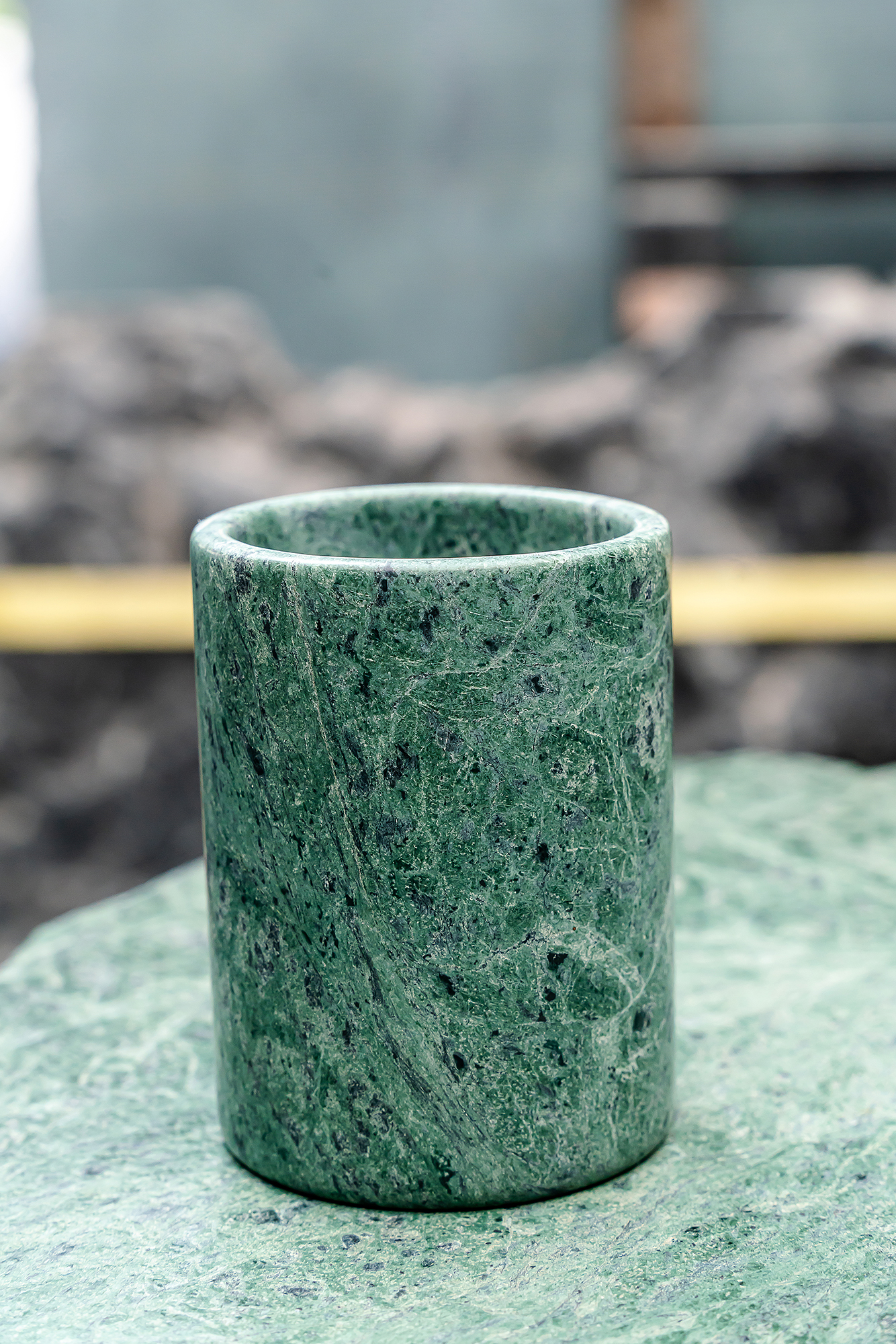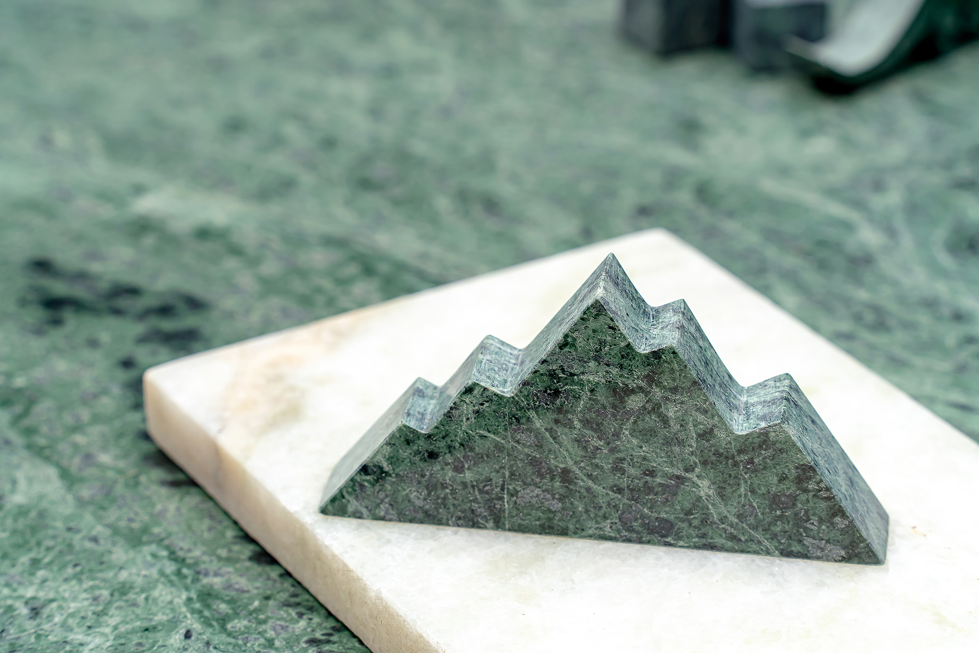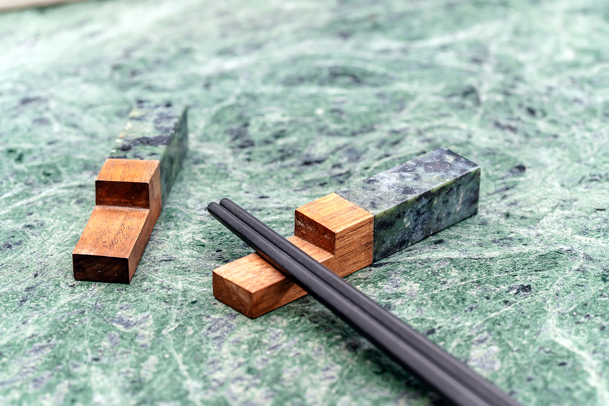 老派的石材「大材小用」,被設計成發財樹擺件、擴香石、筷架、紙鎮、杯具、冰磚等小物,出乎意料顯得摩登。