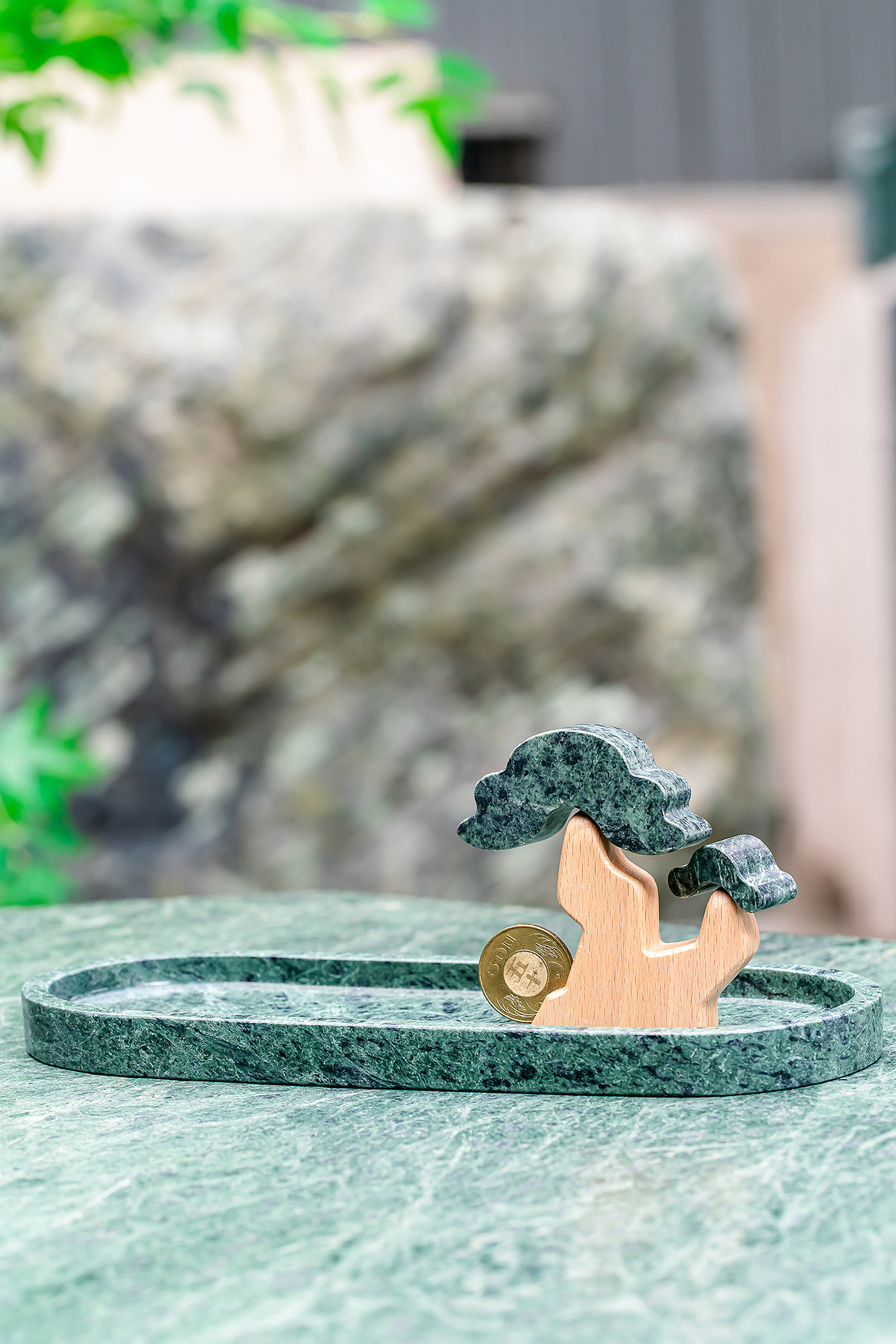 而後,她與設計師合作,開發發財樹擺件,「想做一個具有台灣味,又不俗氣的產品。」張芷毓說。玉石、翡翠,都是發財樹常見的材料,經過蛇紋岩重新詮釋,再結合托盤的功能,時髦又喜氣,產品在募資平台「嘖嘖」上推出,獲得了極高的迴響。