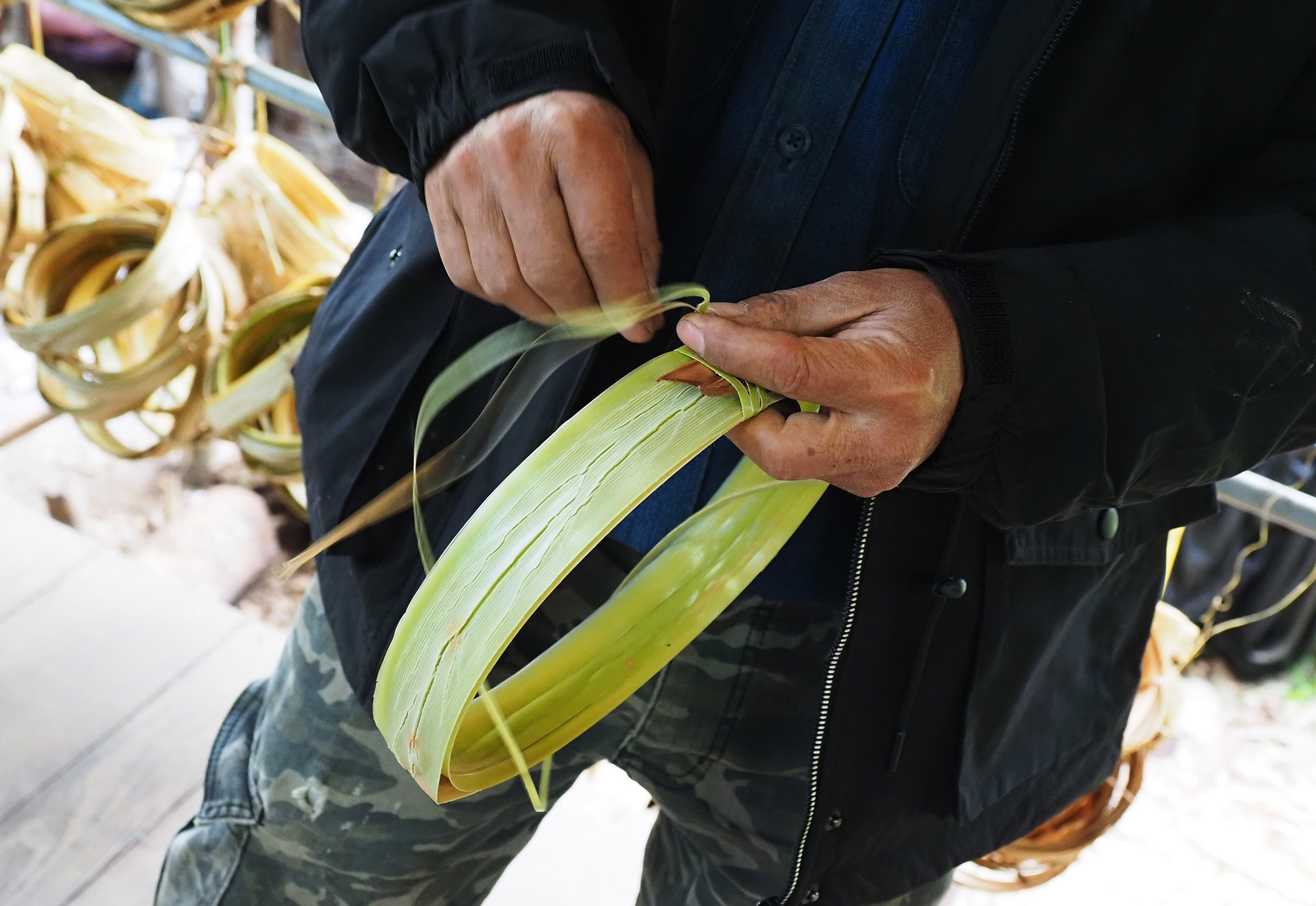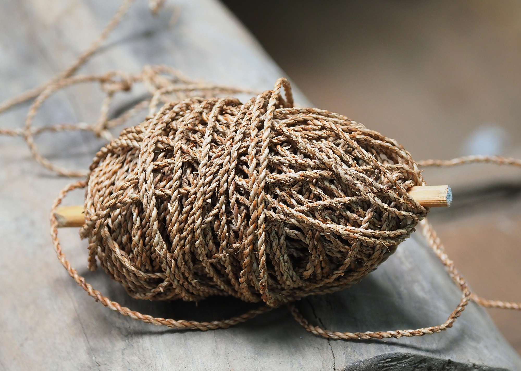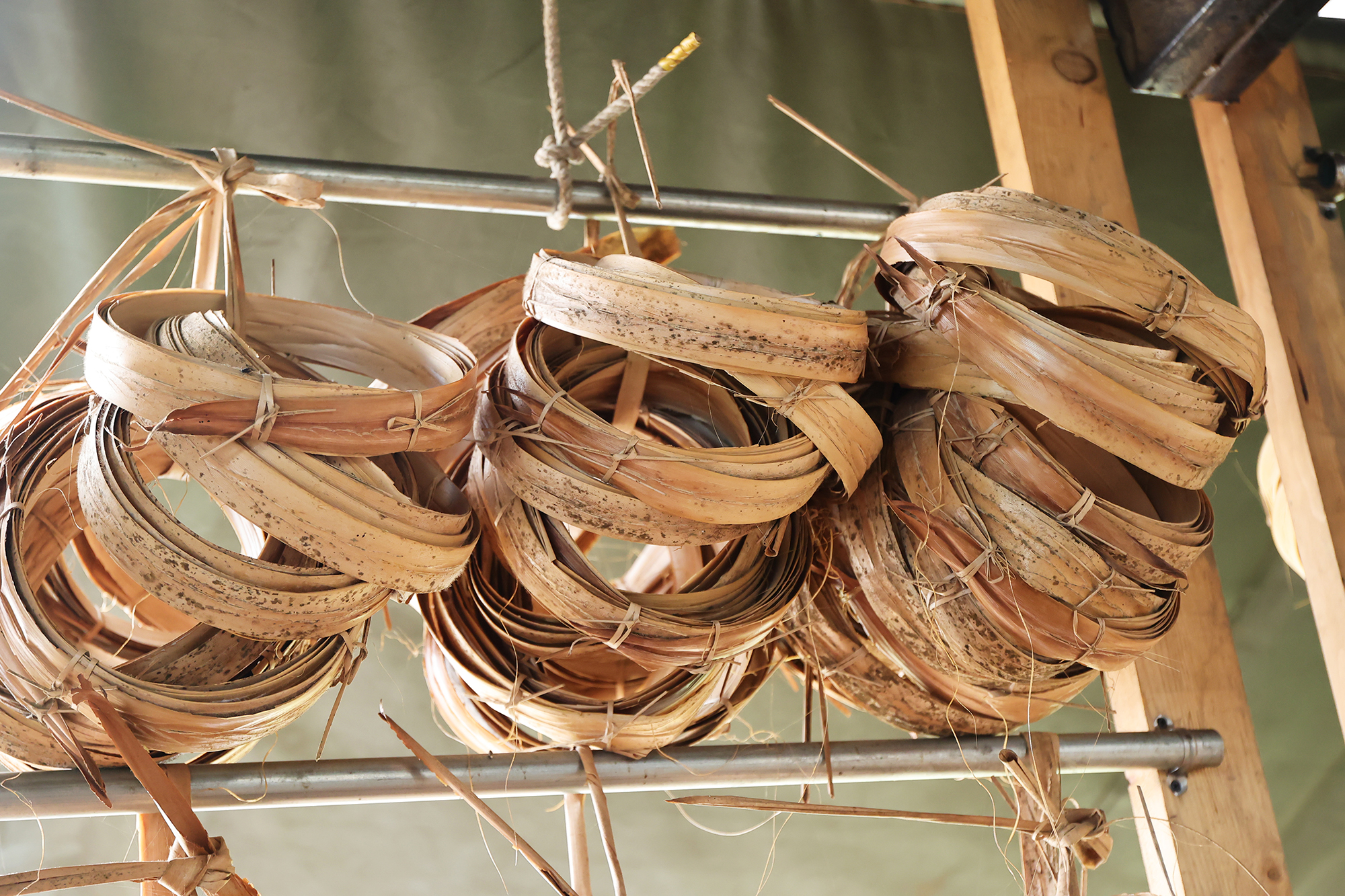 「老人家不會告訴我們這樣做的道理,只是我們在不斷的驗證比對之後,悟出了這個關卡叫做靜置霉化。」要乾多久? 「你不知道齁,月桃也會講話,我要確認過月桃的聲音,才收起來。」她帶領我們到掛滿月桃葉鞘的牆面前,用手擺弄著一捲捲的月桃葉鞘,有的發出清脆的沙沙聲響,有的則是沉甸甸的悶著,就知道纖維裡的水氣尚未全部溢散,還要再等。