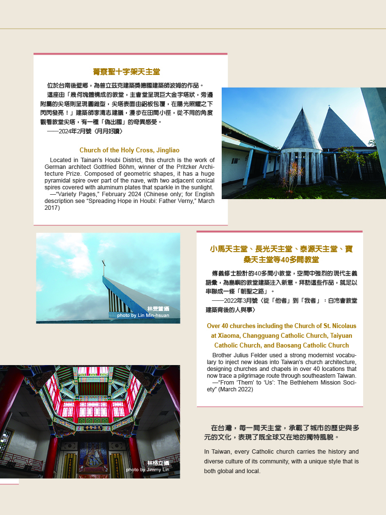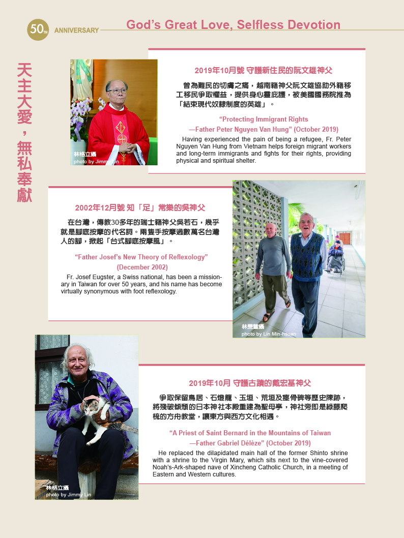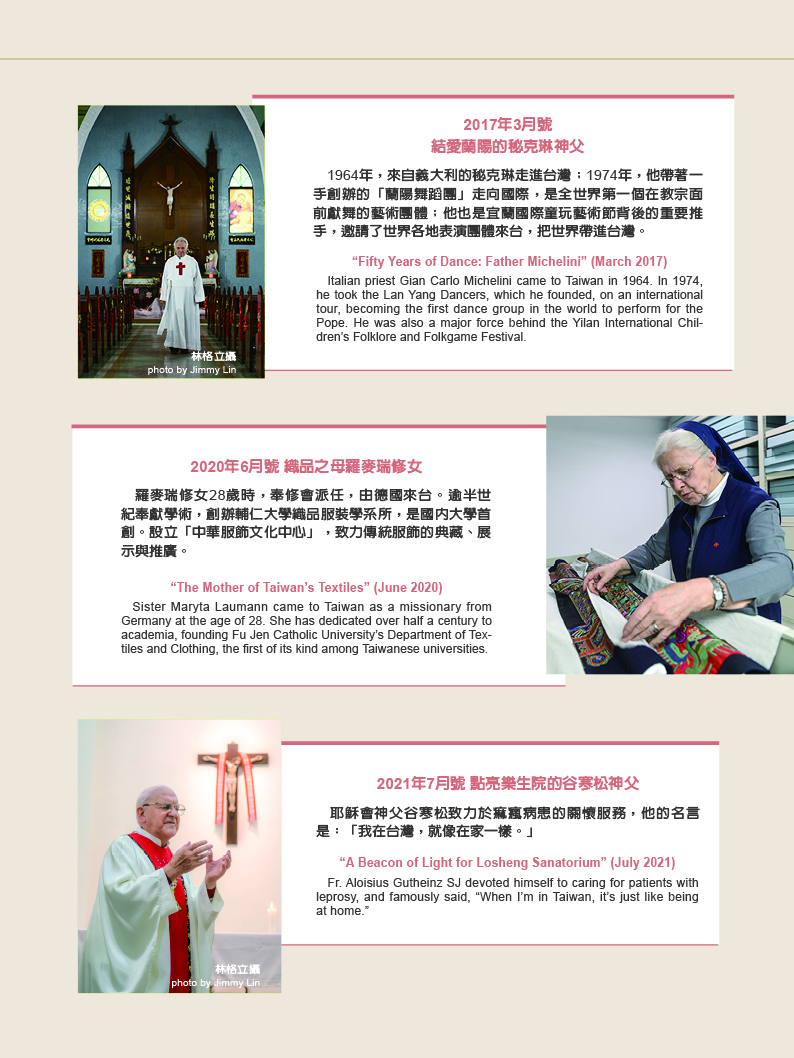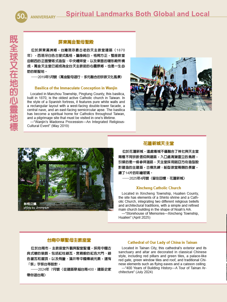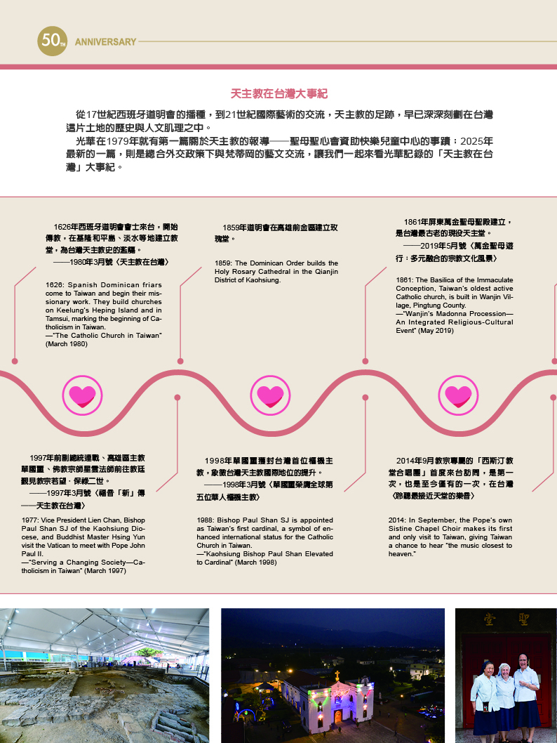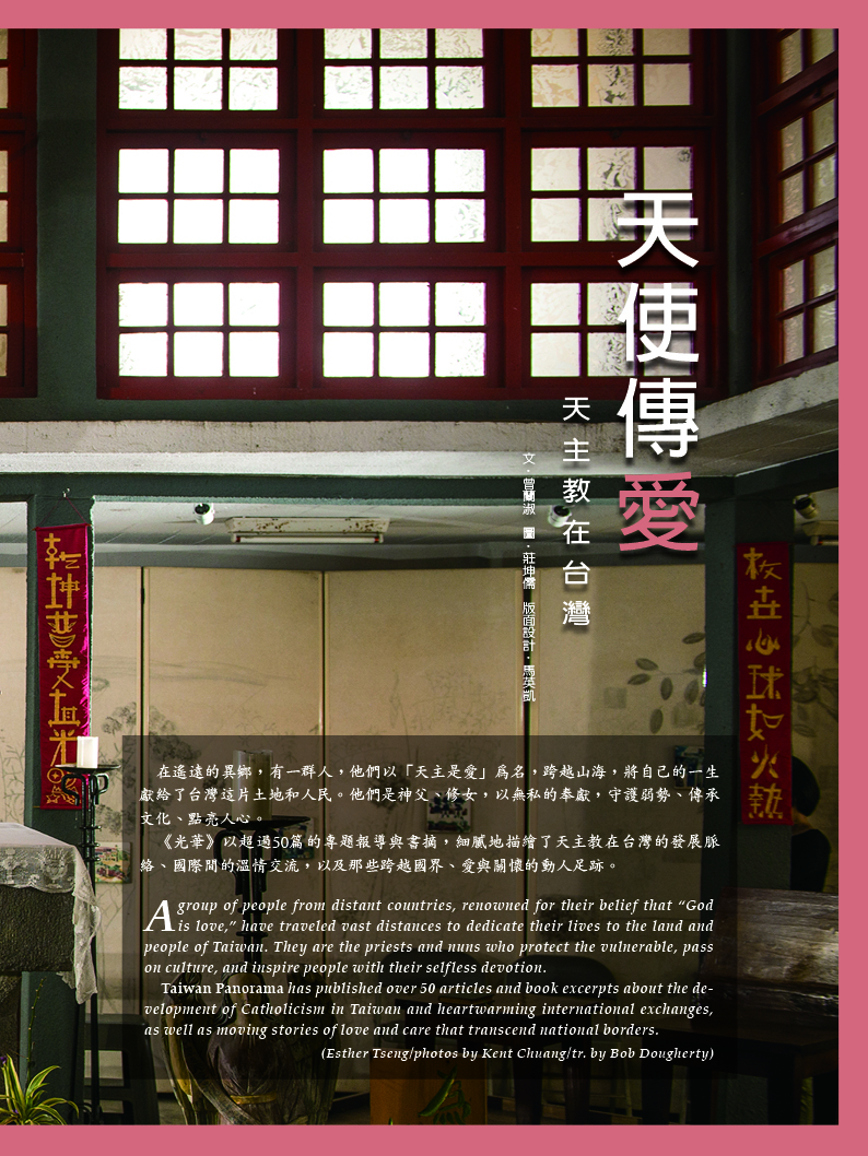 天使傳愛 天主教在台灣 文‧曾蘭淑 圖‧莊坤儒 2025 12月 EN 日本語 分享: . 關鍵字: 光華50 台灣天主教 天主教大事紀 傳教士與修女 屏東萬金天主堂 萬金聖母遊行 天主教堂建築 國際宗教交流 原住民部落文化 輔仁大學 歷史 宗教 新住民 教育 人物 建築 外交 分享:
