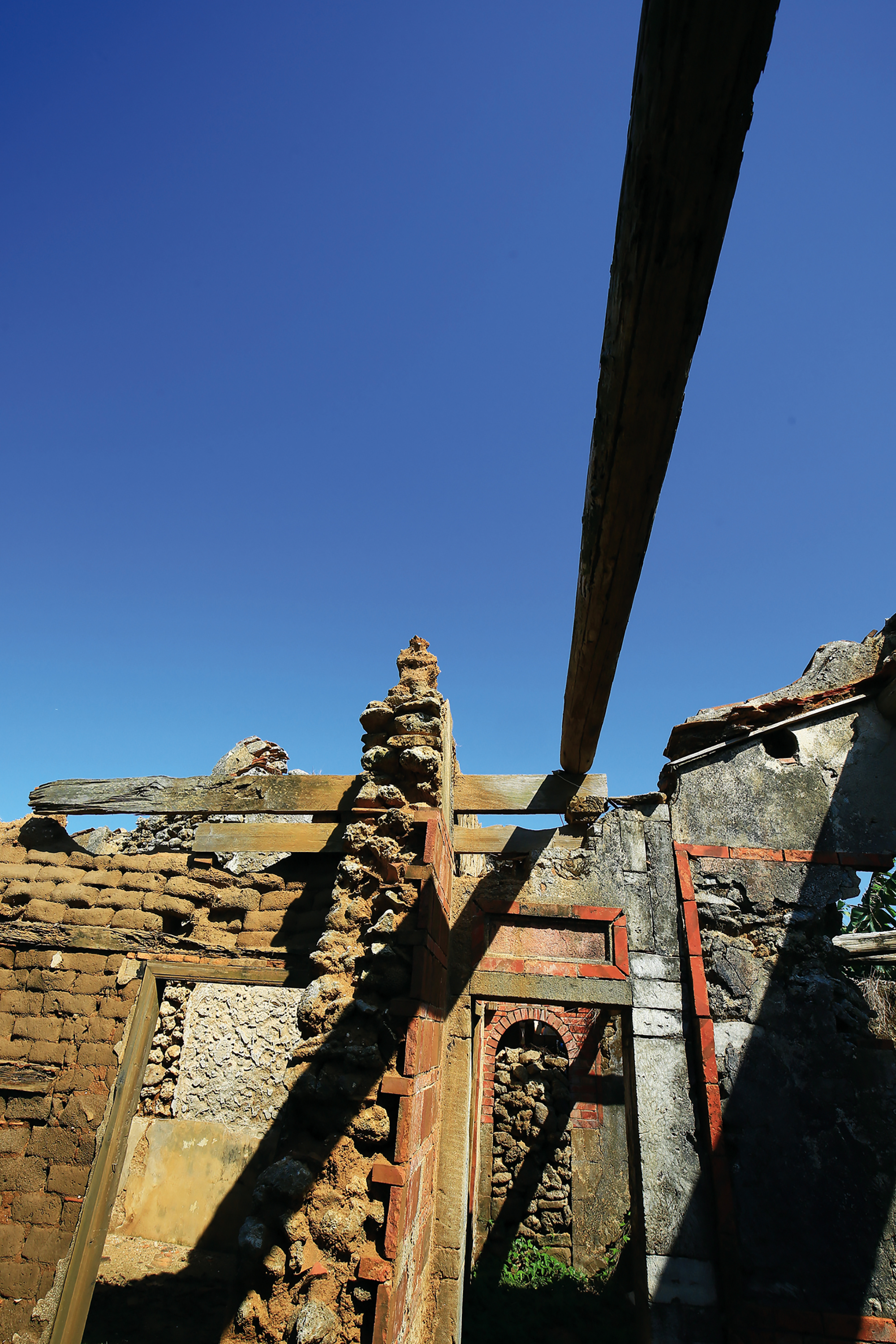南寮社區的古厝,崩解的牆壁上有著使用咾咕石砌牆的痕跡。(林格立攝)